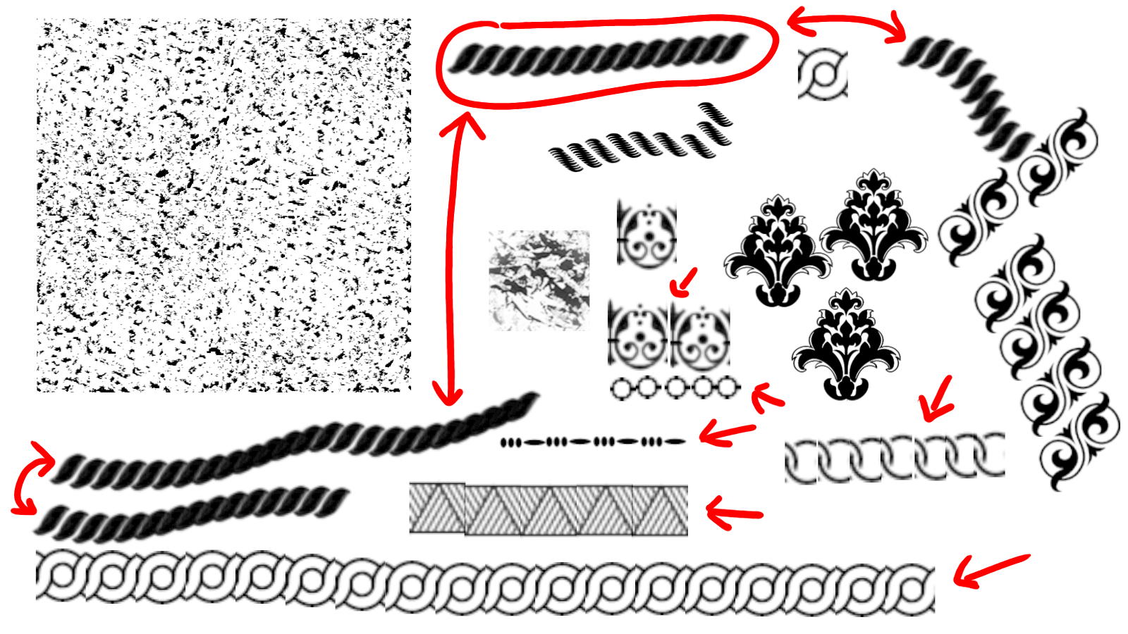 The brushes marked in red were for creating borders. In Photoshop, when I dragged the brush and held the Shift key, the brush was applied correctly in a straight line. In Gimp this doesn’t work unless you do the following: