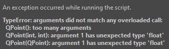 args = ("arguments did not match any overloaded call:\n Q...t(QPoint): argument 1 has unexpected type 'float'",)