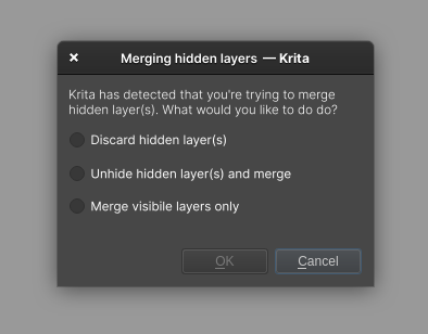 If Krita could remember your last choice, does merging hidden layers occur often enough that asking users to just click ‘ok’/press enter every time is too much? I personally don’t feel it necessarily is but I could be in the minority!