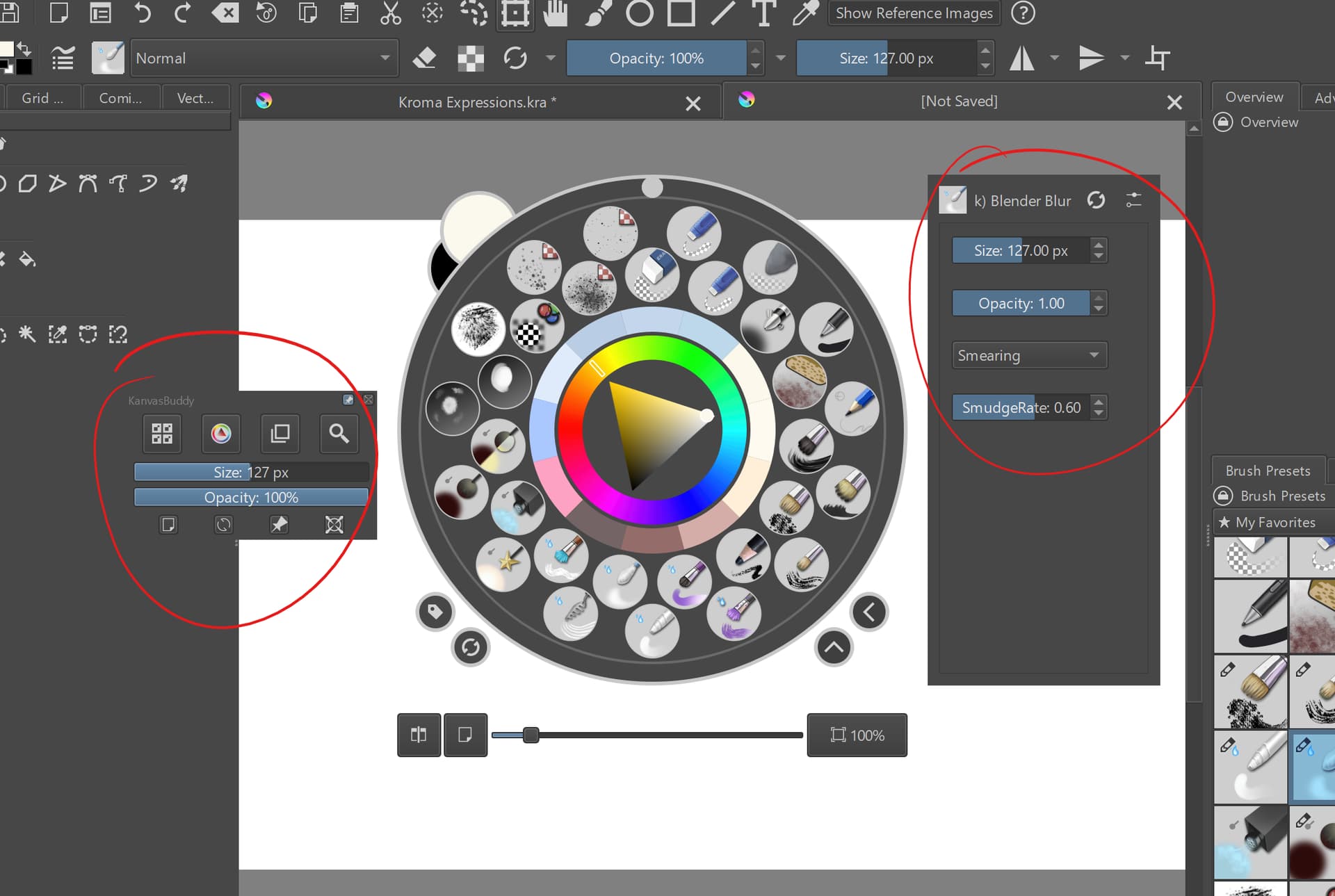 Yesterday, somebody introduced me to this useful plugin called Kanvas Buddy which broke in Krita 5 and another person updated it to make it work. This has been exceptionally helpful and I achieved my goal with it. However, I can’t help but feel like the pop up palette has the potential to do this in the main program all on its own. Or, for somebody to implement a Kanvas Buddy like feature within the main program itself.