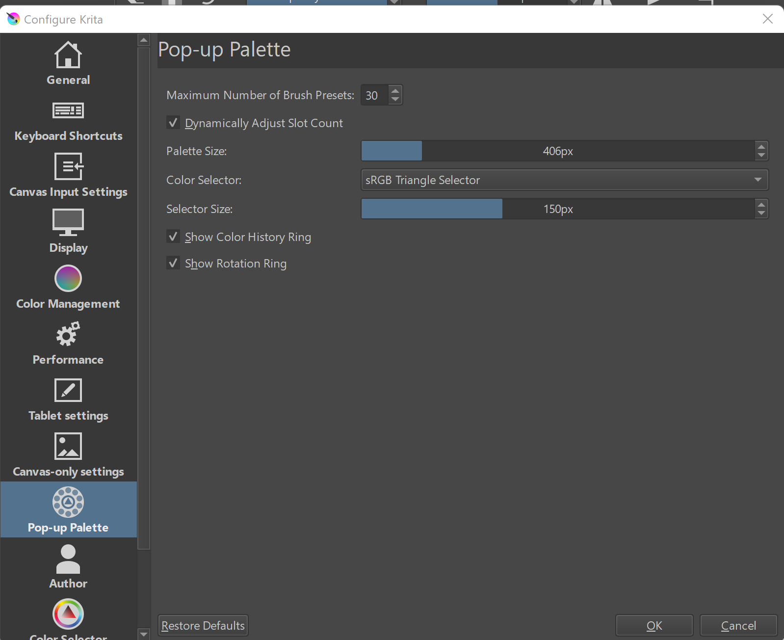 For example, the pop up palette has a menu to the right that opens up a miniature docker that allows you to access brush settings. I already have access to that thanks to the top bar being available. And I was shocked to see that the settings for the pop up palette was extremely limited! I think that there should be more settings for the pop up palette including miniature versions of the dockers and people can customize what dockers appear in that menu of the pop up palette.