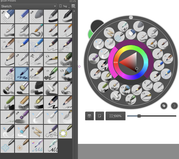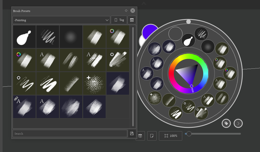 I am ok with circle also, but I wish it would be more flexible for those like me. Fore example, ability to divide by sectors (1 to 10), and each sector could be assign to tag (like now all circle is single tag), and adding more slots (up to 100) could resolve question of grouping and having all under the hand. In that case all artist could customize pop-up palette up to their needs. But I can’t imagine amount of work for the programmers to implement such stuff. So now I just have to use docker that is opened all the time.