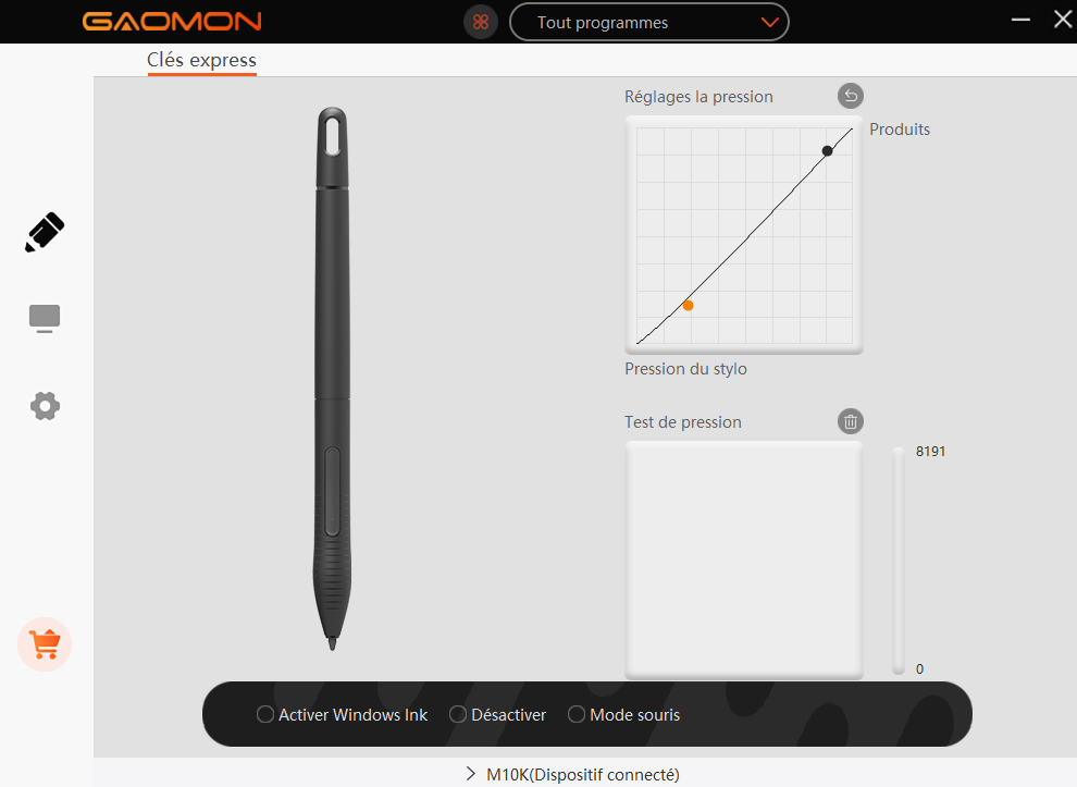 At the top of the Gaomon driver setup window is a button labelled “Toutes Programmes”.