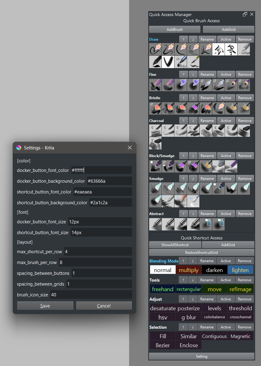 A plugin for Krita that provides quick access to brush presets and shortcut management.