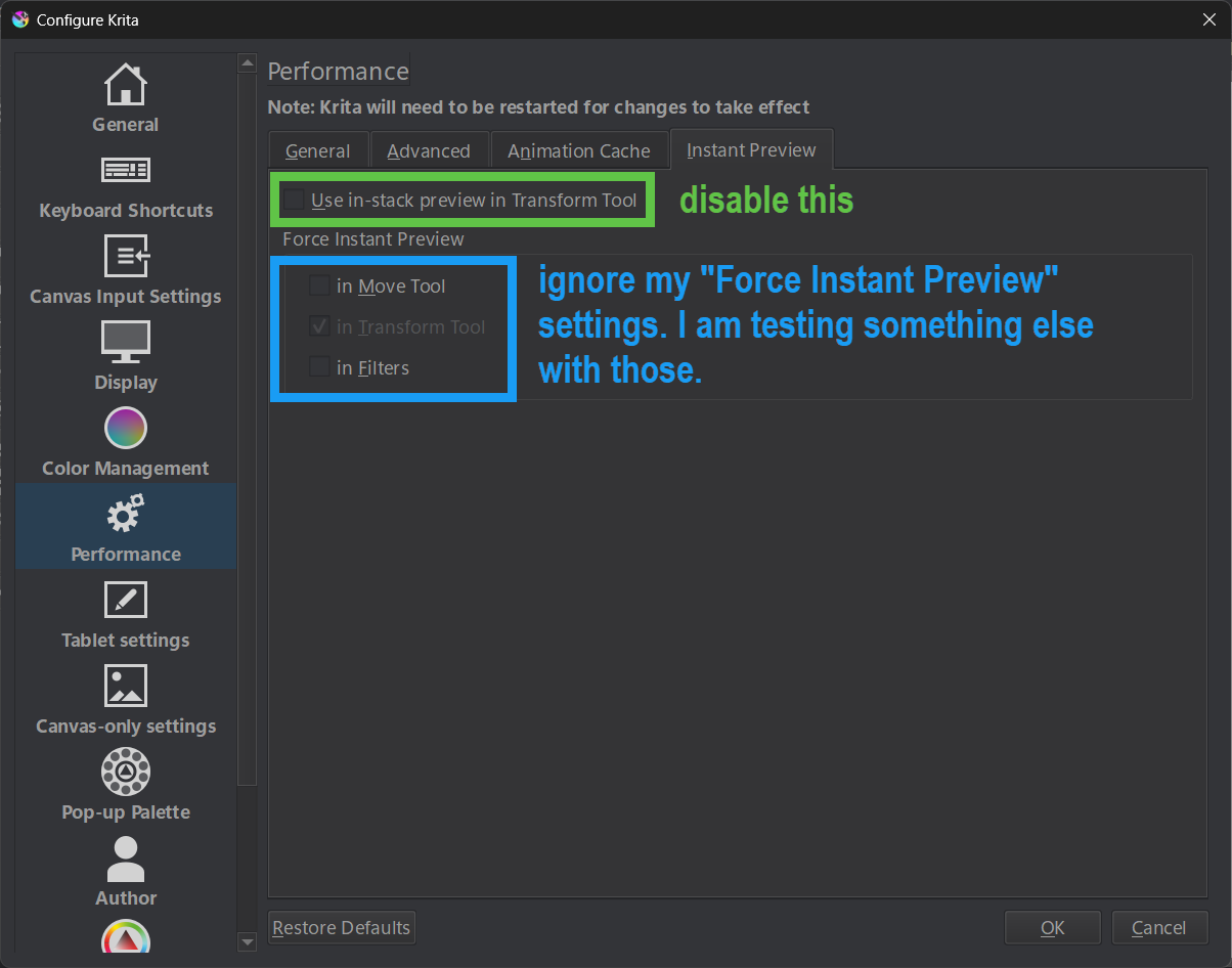 Menu → Settings → Configure Krita → Performance section → Instant Preview tab: