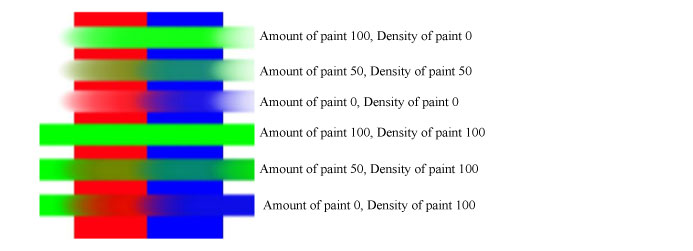 Configures the amount of paint for the drawing color. Amount of paint is the ratio for mixing the RGB components of the drawing color with the ground color (color already painted on the layer). The bigger value is, the higher percentage of RGB values of drawing color.