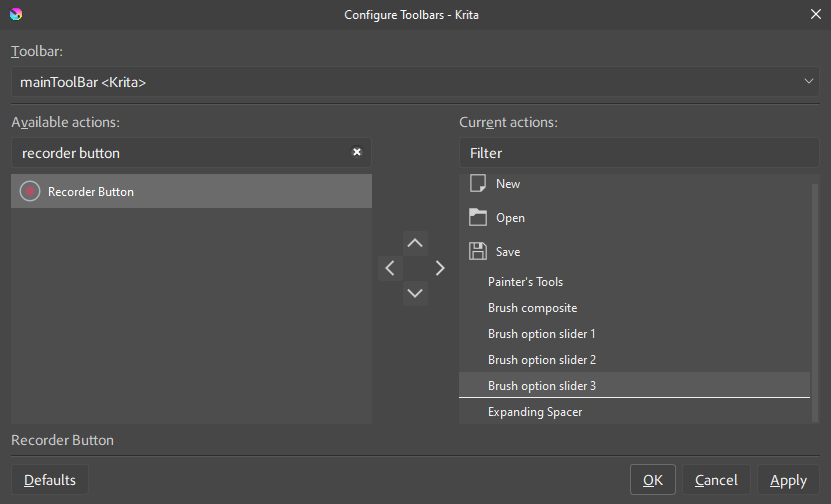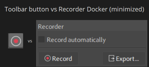 Recorder Button can be added to your toolbar and it will display your recording status with its icon. You can also left-click it to start or stop recording and right-click it to open the Recording docker at your cursor.