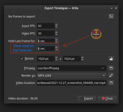 That’s why here is a feature request to also get an export option to show the result on the first frame of the exported movie, for a certain duration. Here is a quick mockup: