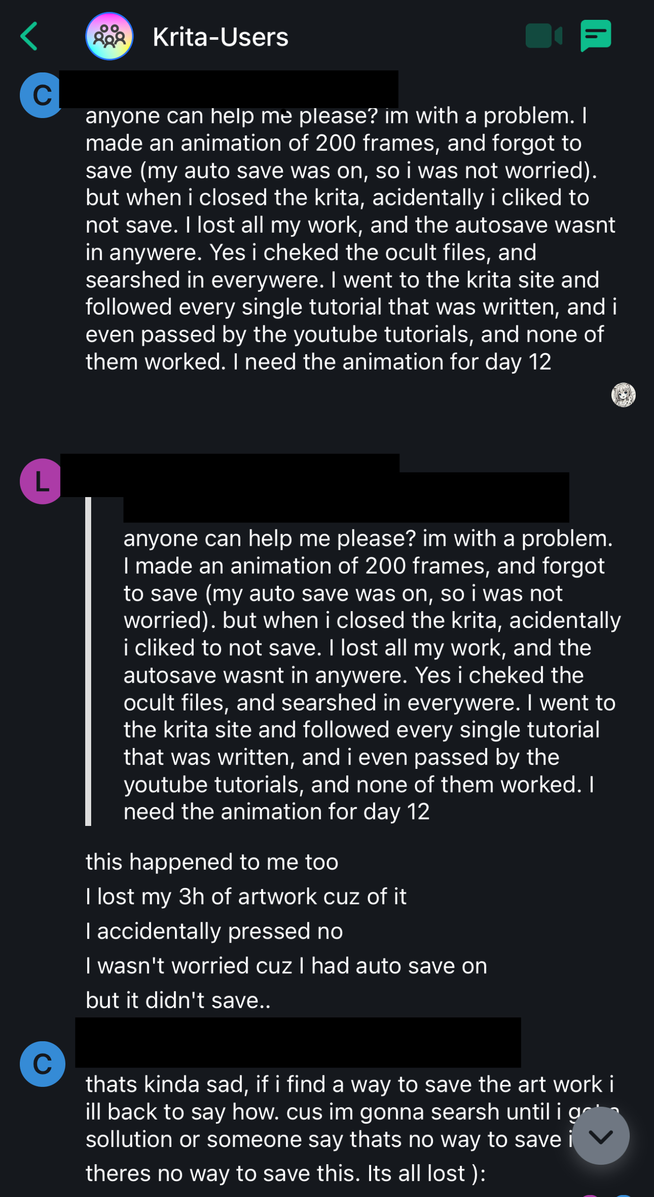 People often enough think that the auto-save function will save the work for them and then get disappointed when there is no file after they close the program and didn’t save the file on their own, and their hard work is gone. Honestly I can’t blame them, the name is a bit misleading when comparing what it actually does to other software. I think it would be better to change the name of the functionality to something like auto-recovery or anything along the line, to better convey that this is just for when things go wrong, not an actual save.