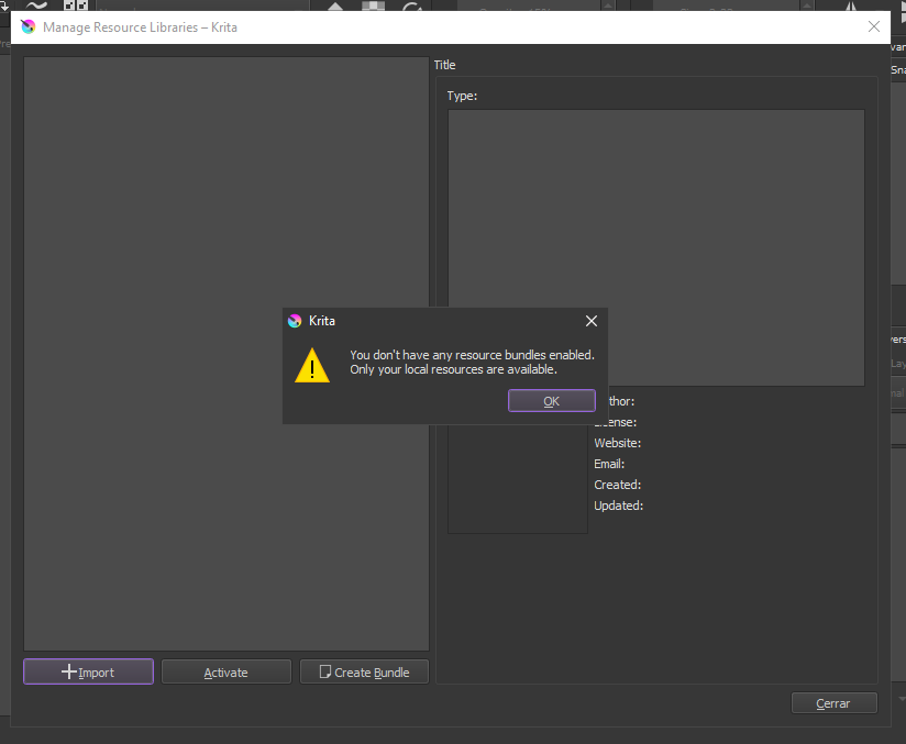 I had copied a huge amount of ABR files into the Brushes folder to test Krita’s limits (I didn’t know that ABR files are handled differently now) and THEN had the problem you described. The same error message and nothing was displayed in the dialog windows shown by you.