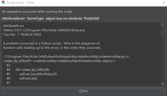 File "C:\Program Files\Krita (x64)\share\krita\pykrita\rotatebrushtip\rotatebrushtip.py", line 80, in selectBrushContainer