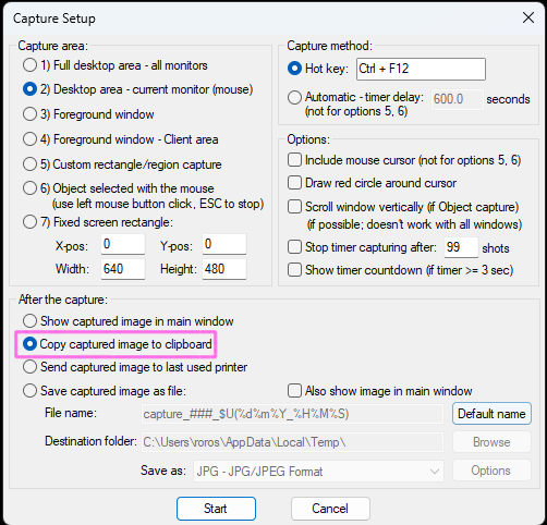 Another advantage of IrfanView over the Windows on-board tools is the ability to photograph the cursor as well. You can find the screenshot tool in the Options menu, the shortcut is the key C.