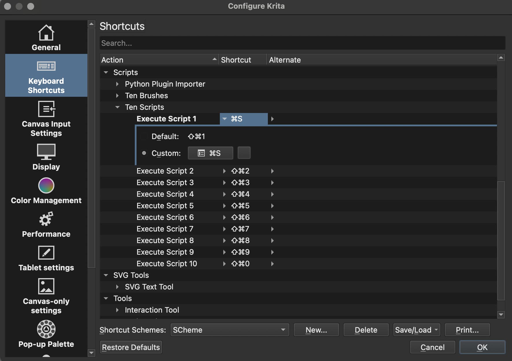 To make it easier to use I changed the default first script shortcut (Shift+Cmd+1) to the default saving shortcut (Cmd+s), this can be done in Krita>Preferences>Keyboard Shortcuts as shown below.