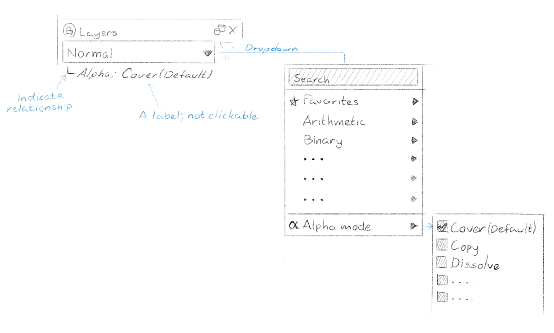 I do like that suggestion, but my complaint is that it’s not as flexible. However, as a customizable setting, I think that would work out. Another solution I can see is to move Alpha Mode as a small icon with dropdown next to blending mode as a compromise between the two.