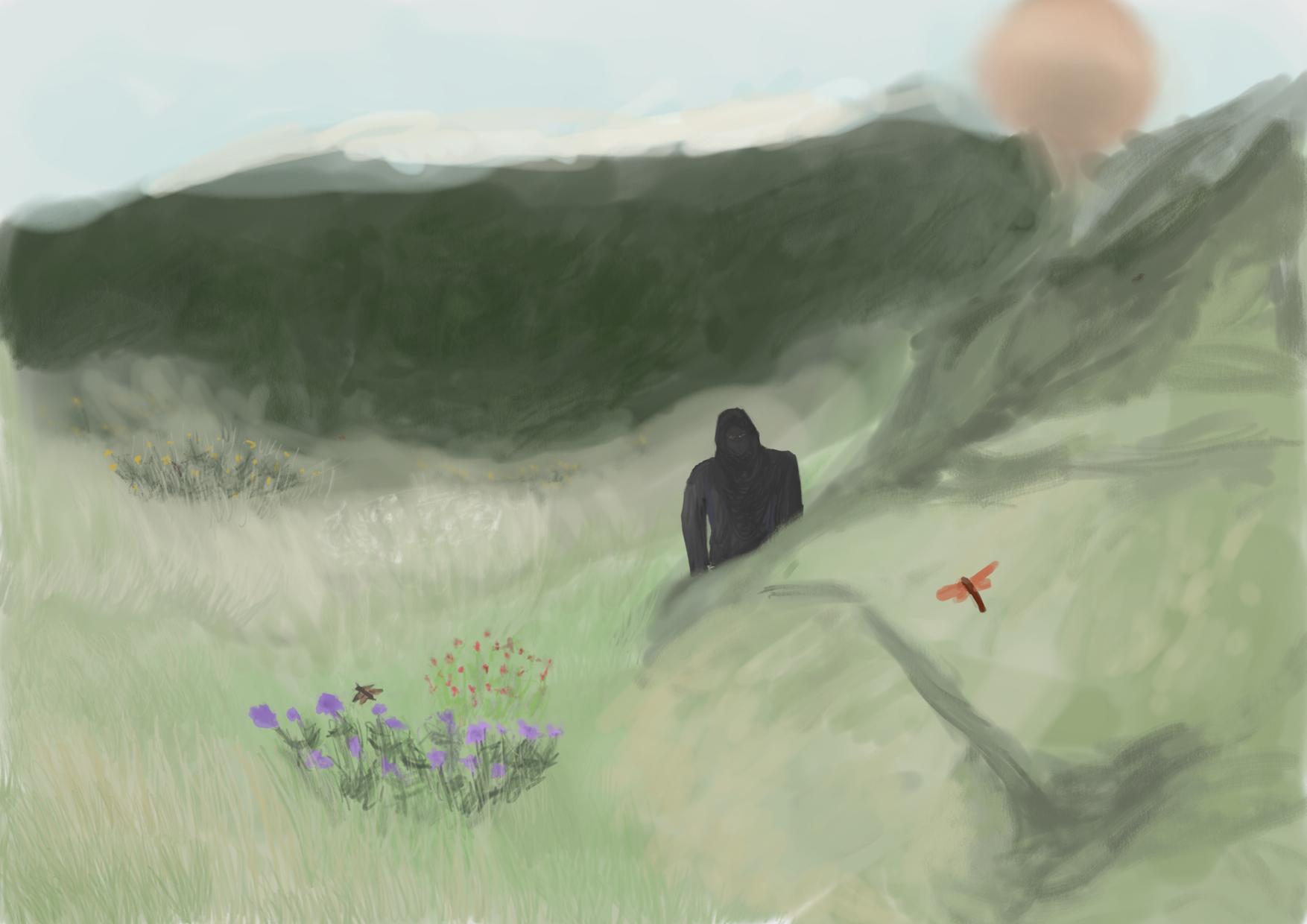 The idea is a ninja lying in wait in a sort of prairie valley with grass, flowers, and insects. I’m not sure whether the round orange thing is a strange sun or a strange structure in the distance. But I like prairies, so it was nice to do a little practice trying to draw one.