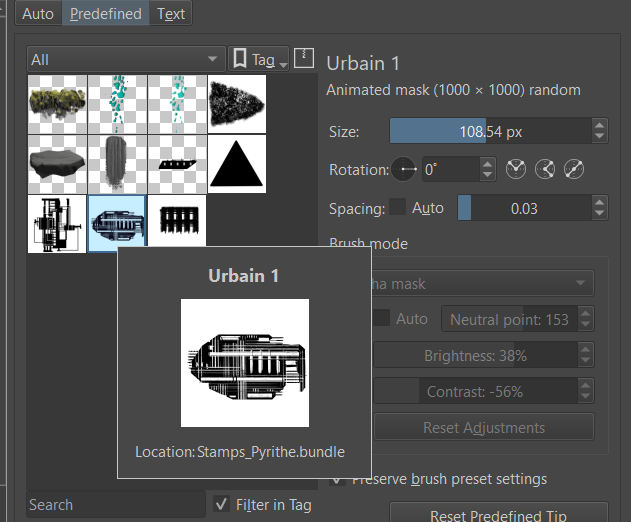 (once again idk if you’ll download the final dynamic stamps, or if you’ll have to created them from the files. in this it’s very simple to do ; you select a default dynamic stamp like “meca shapes” and you choose one of the pattern in this bundle. unclick rotation, save a new brush/stamp and you should have it)