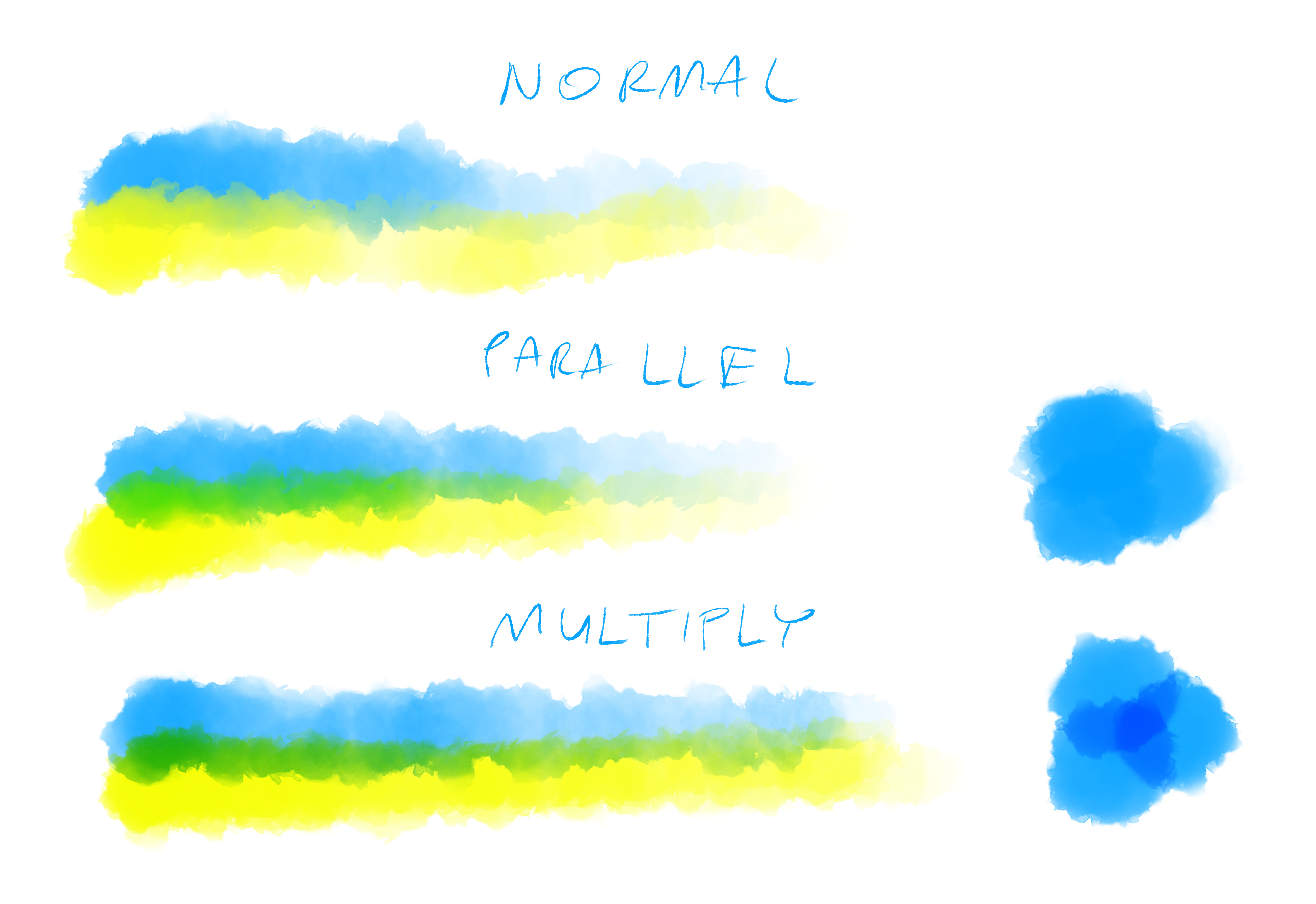 Another good blending mode for watercolors is Greater, but I think I never liked how it worked with different colors, it only looked good and watercolory if you used the same color with some super fancy-looking watercolor brushes. (Actually, with different colors it might just not work…)
