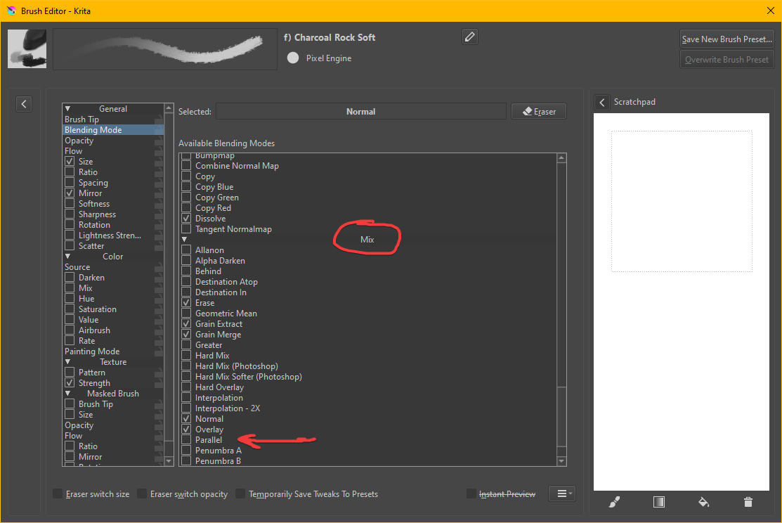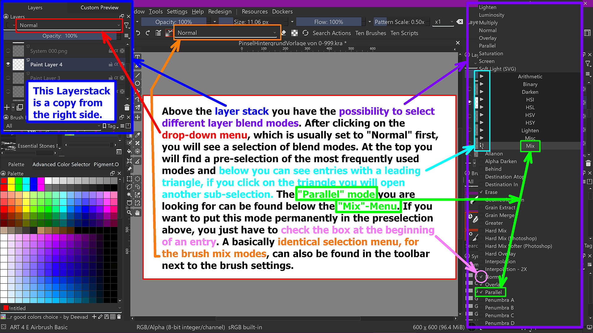 Also, above the layer-stack, you have the possibility to select different layer blend modes. After clicking on the drop-down menu, which is usually set to “Normal” first, you will see a selection of blend modes. At the top you will find a pre-selection of the most frequently used modes and below you can see entries with a leading triangle, if you click on the triangle you will open another sub-selection. The “Parallel” mode you are looking for can be found below the “Mix” level. If you want to put this mode permanently in the preselection above, you just have to check the box at the beginning of its entry. A basically identical selection menu, for the brush mix modes, can also be found in the toolbar next to the brush settings (the layer-stack, on the top-left side, is copied from the right side, because the open blending-modes are hiding it).