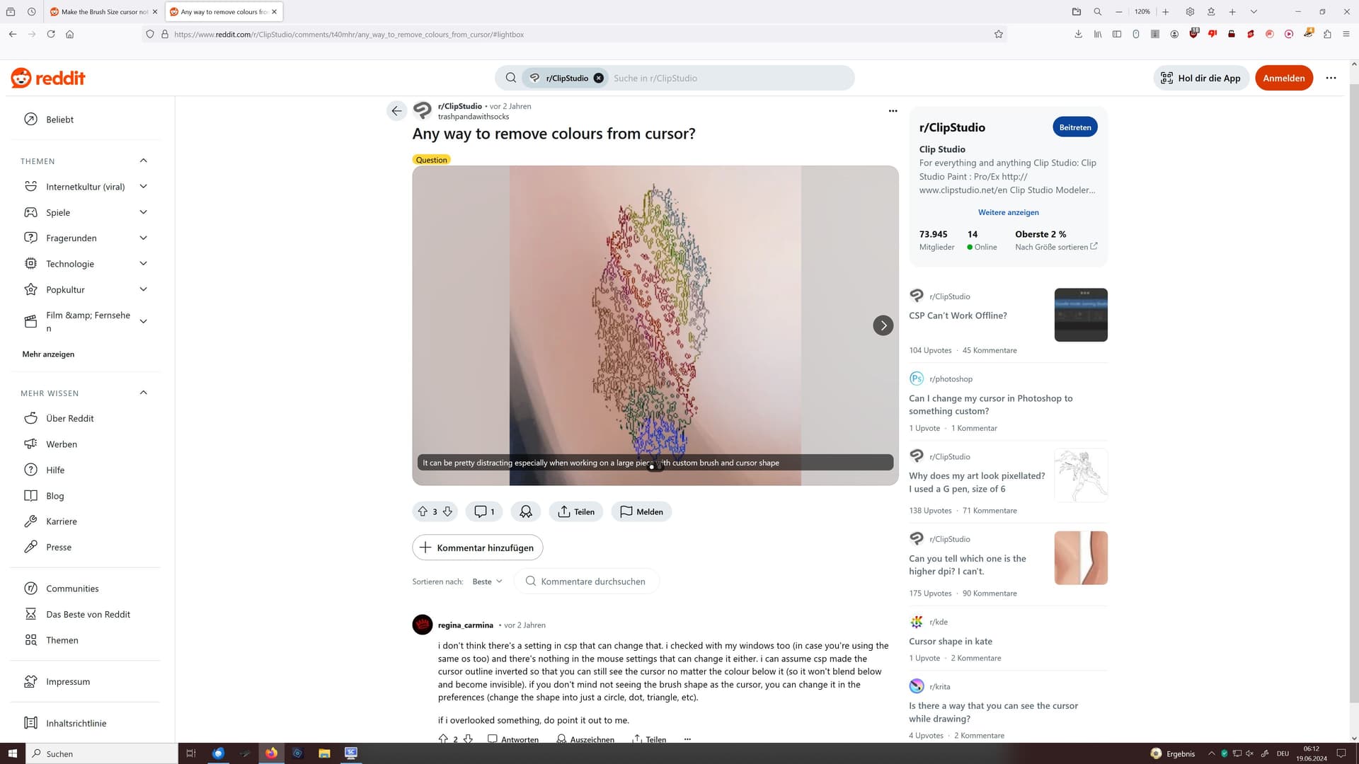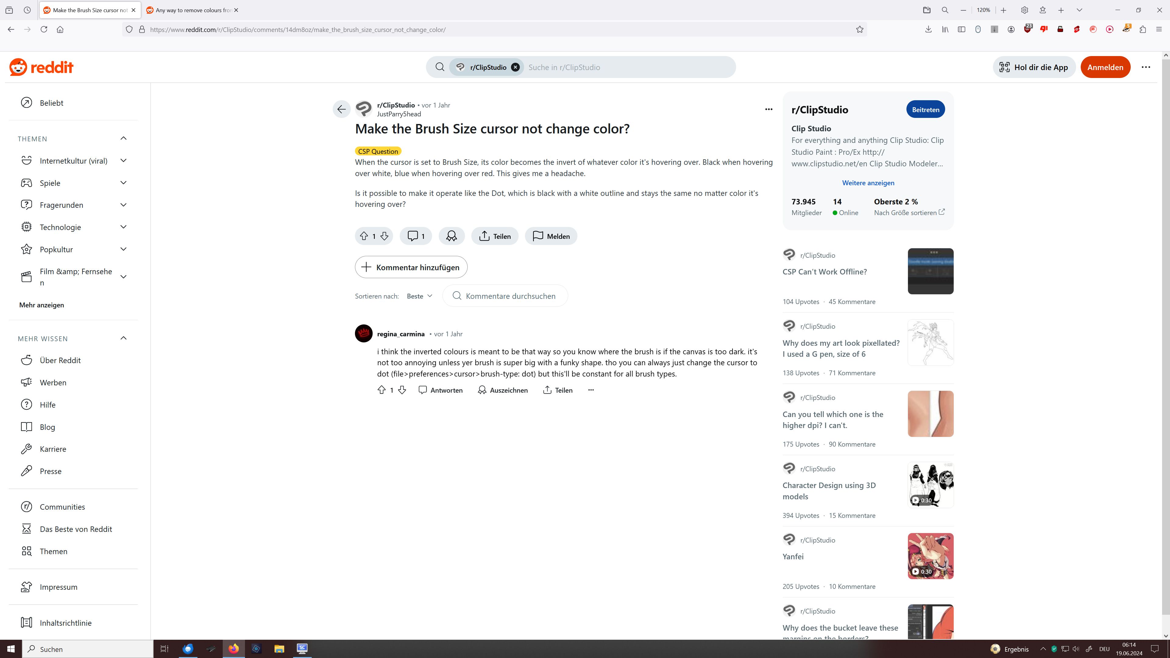 Screenshot 1: Clip Studio Paint Pro user and possible migraine patient complaining about headache through color changing Brush Size cursor in CSP: