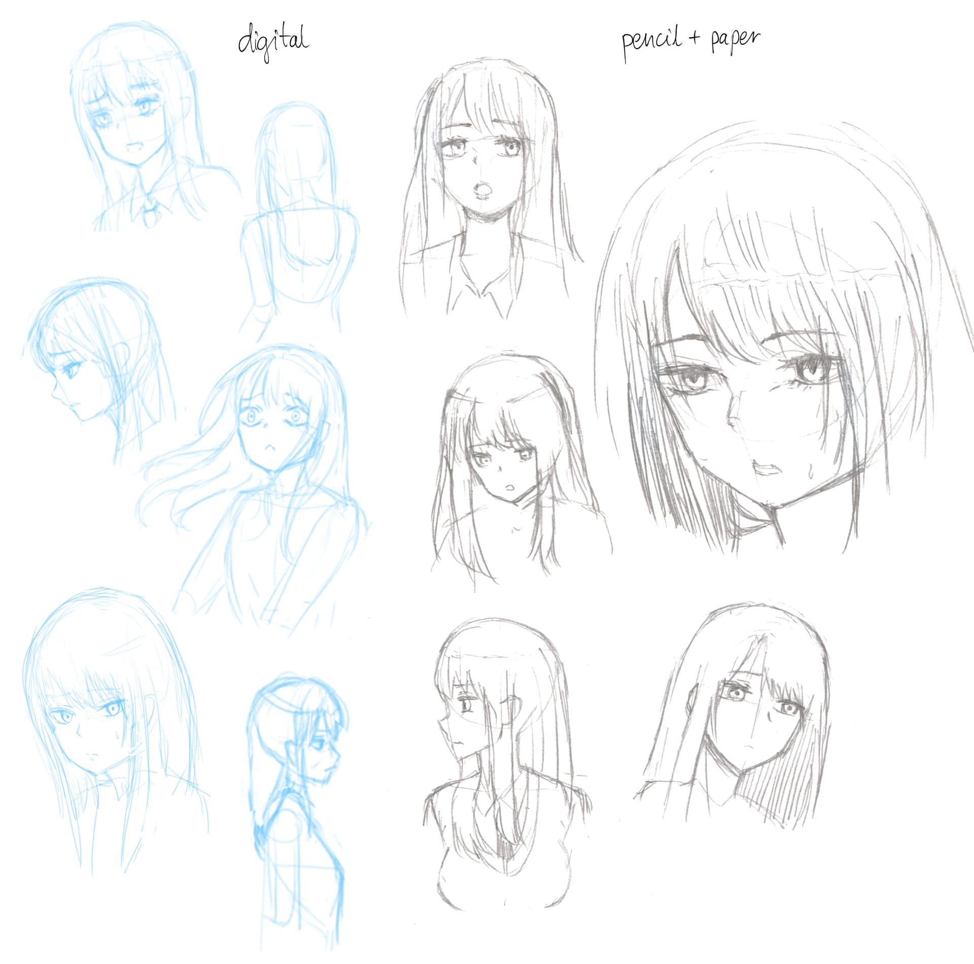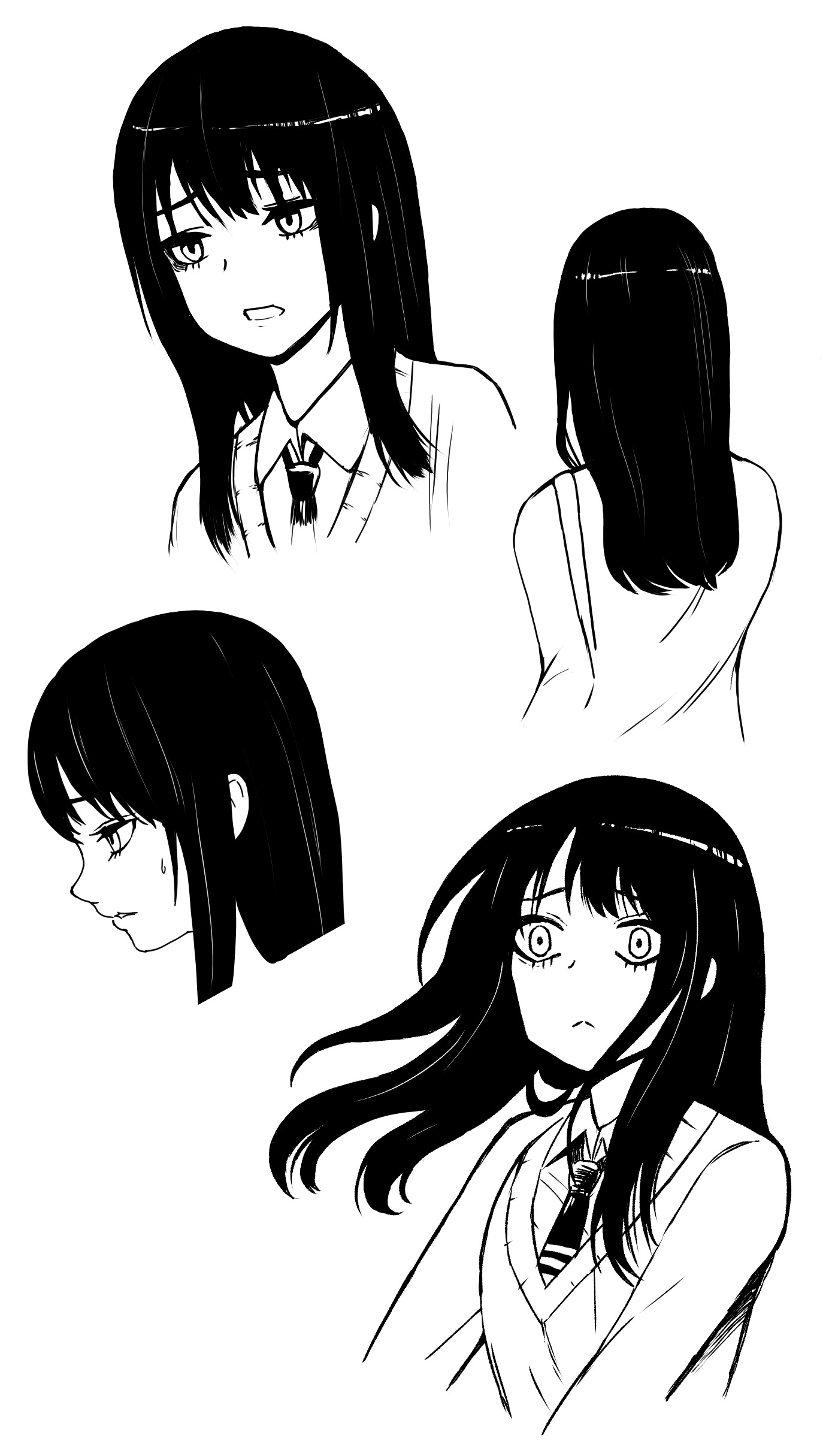 I’ve been grinding some study sketches from Mieruko-chan manga (it’s awesome, and so is the anime) to practice heads and faces. Below is a mix of digital in Krita and traditional done over a few days.