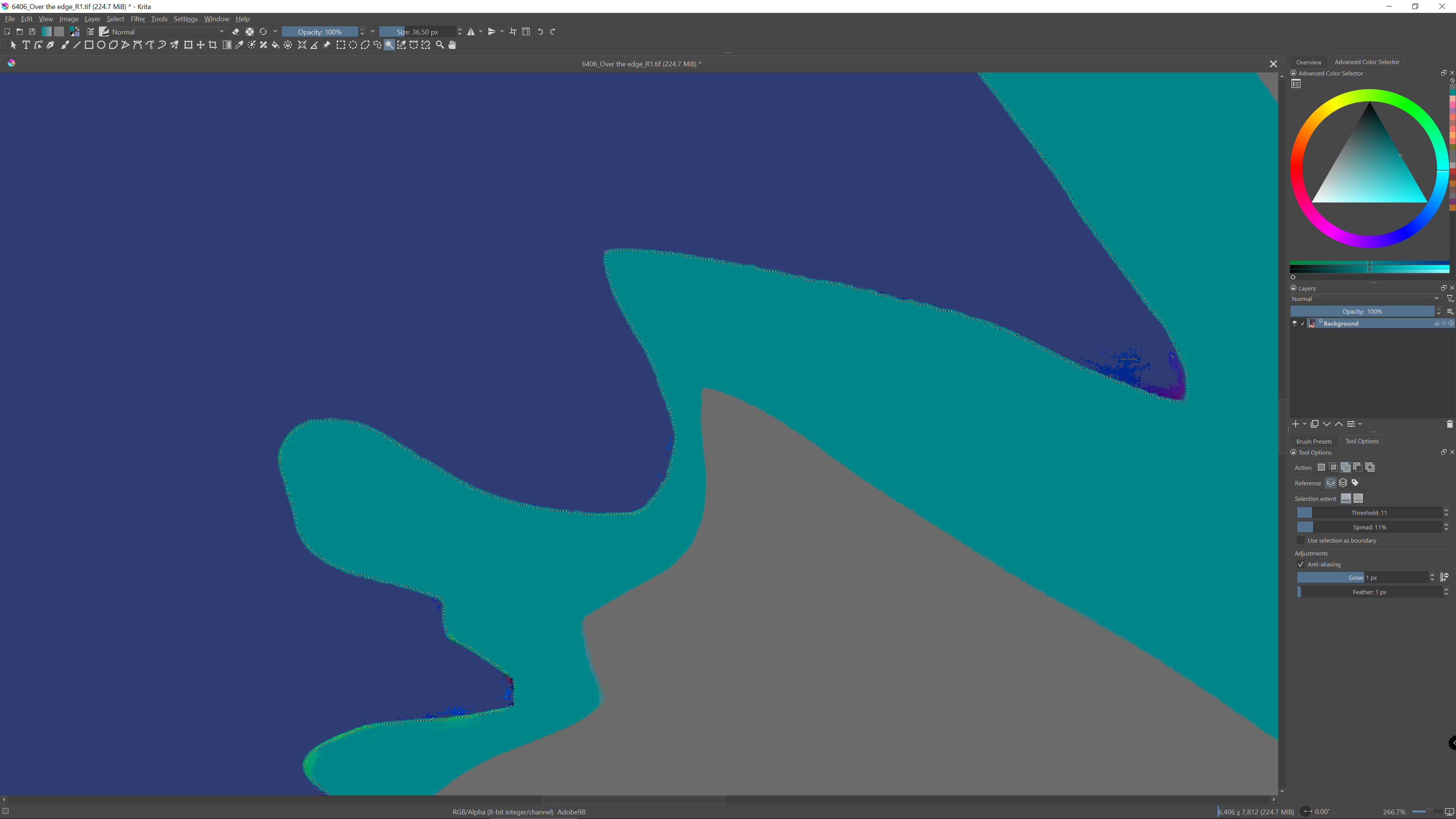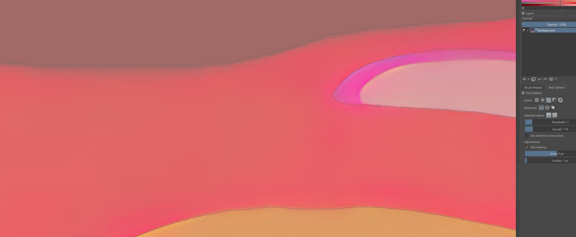 I have tried these things. I’ve been faffing about with it for hours. What’s needed, I think, is a button that flattens selection edges to removes the staircasing effect along the edge of the selection and produce a smooth curve. That would put some pixels outside of the selection, but then by applying the same process when selecting the adjacent area, these would be removed and you would end up with two smoothly abutting areas. It seems to me anyway. There is a smoothing function in Krita under selection/transform, but all that seems to do is feather it. Perhaps there’s a good reason why this is an unreasonable request.