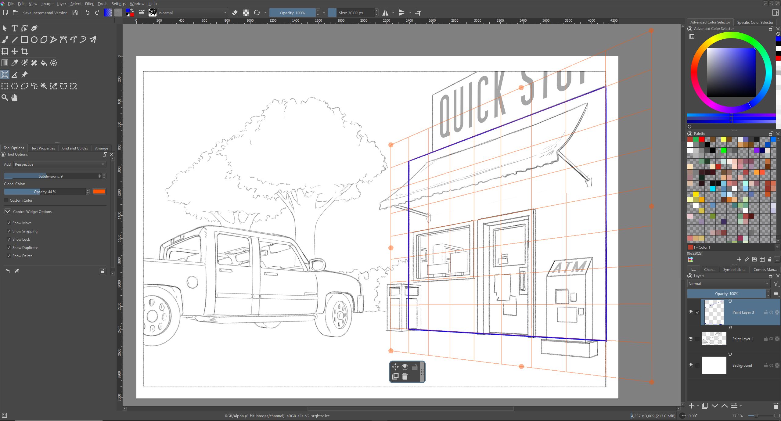 Question: what do you recommend to draw the edges of a perspective grid? Should I use one of the other Assistant options? (but the grid is the easiest to use and understand to me - in fact I started using 2 Point perspective and still ended making a Perspective grid based on that, because of the nice delimitation in 8x8 cells)