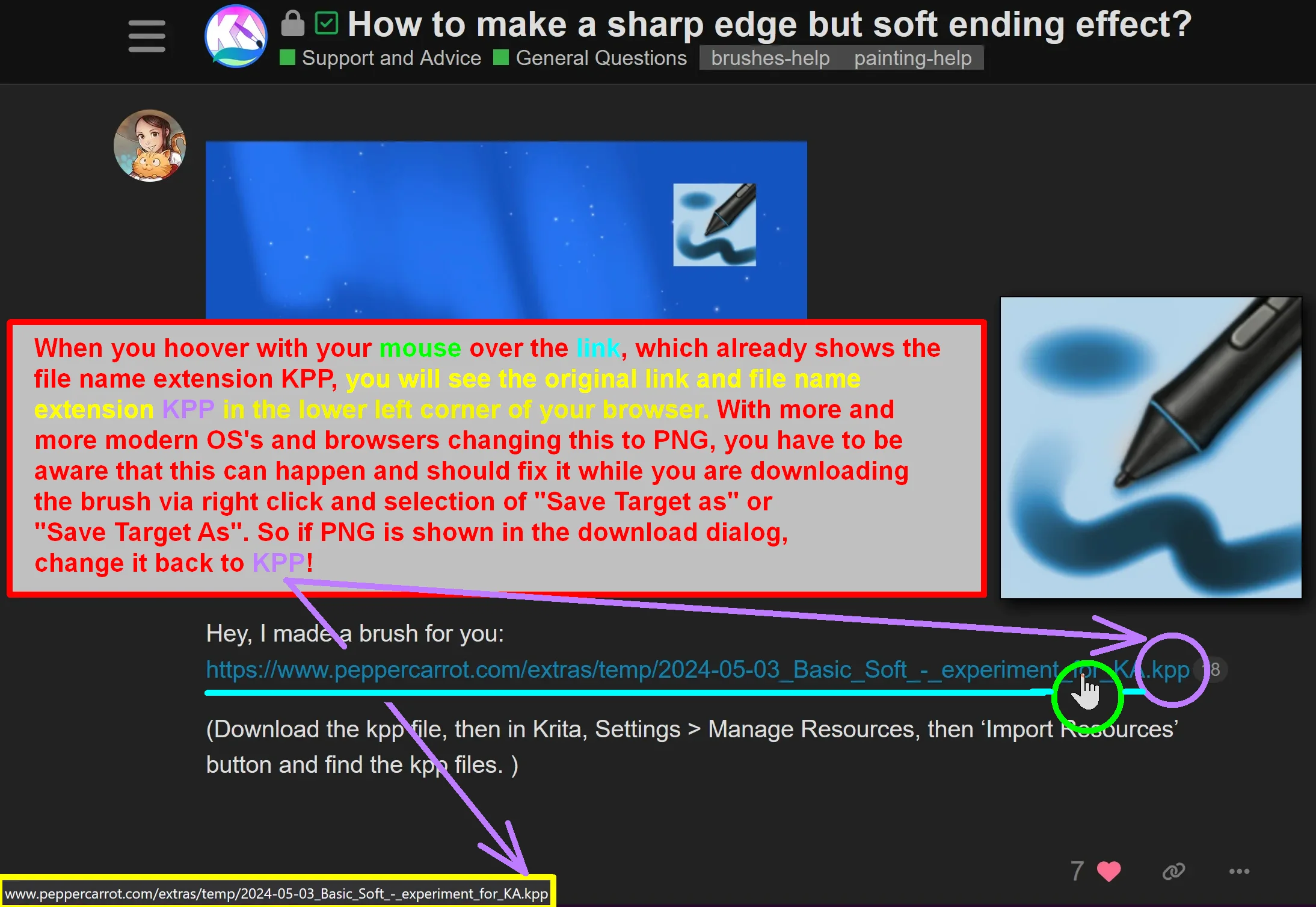 When you hoover with your mouse over the download link of that brush, which already shows the file name extension KPP, you will see the original link and file name extension KPP in the lower left corner of your browser. With more and more modern OS’s and browsers changing this to PNG, you have to be aware that this can happen and should fix it while you are downloading the brush via right click and selection of “Save Target as” or “Save Link As”. So if PNG is shown in the download dialog, change it back to KPP!