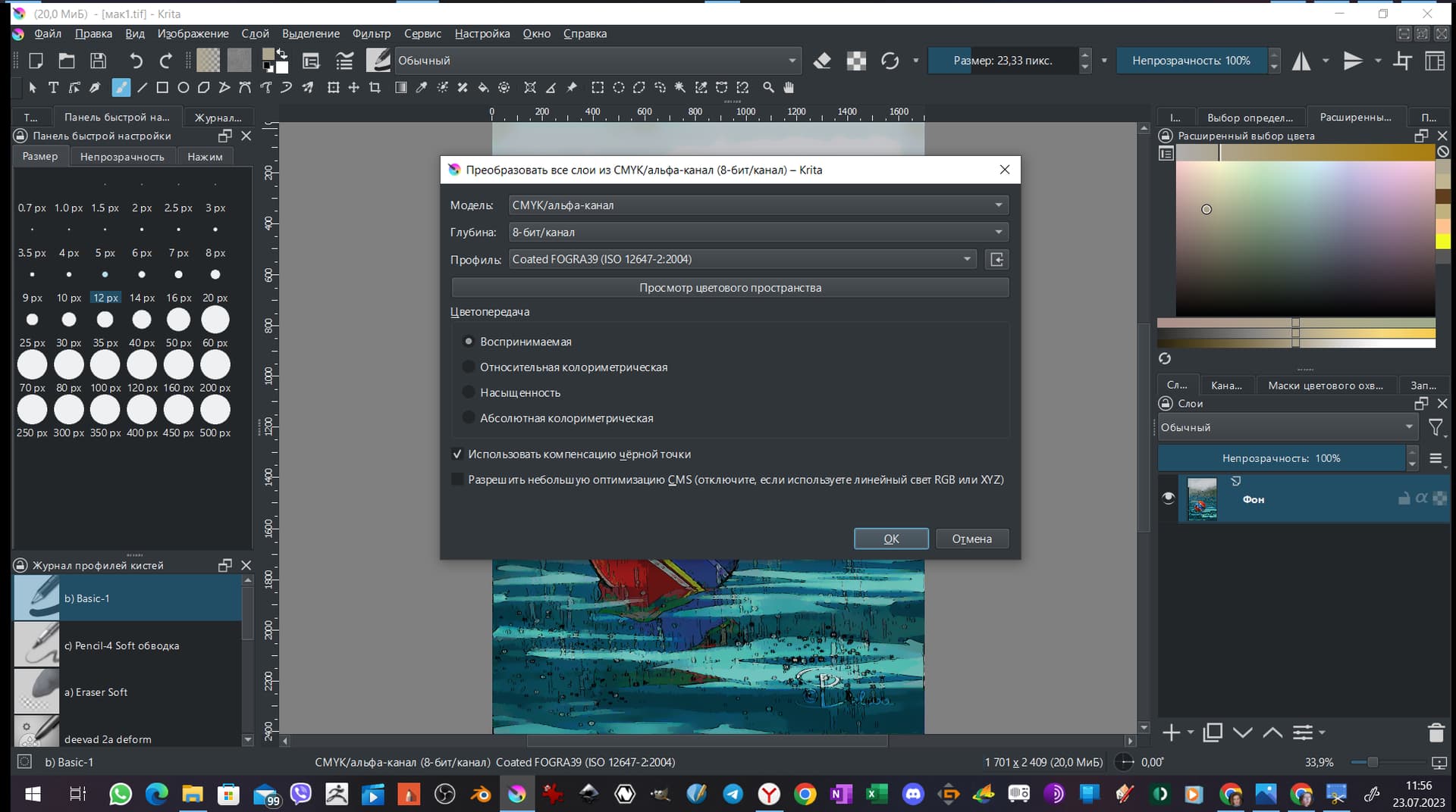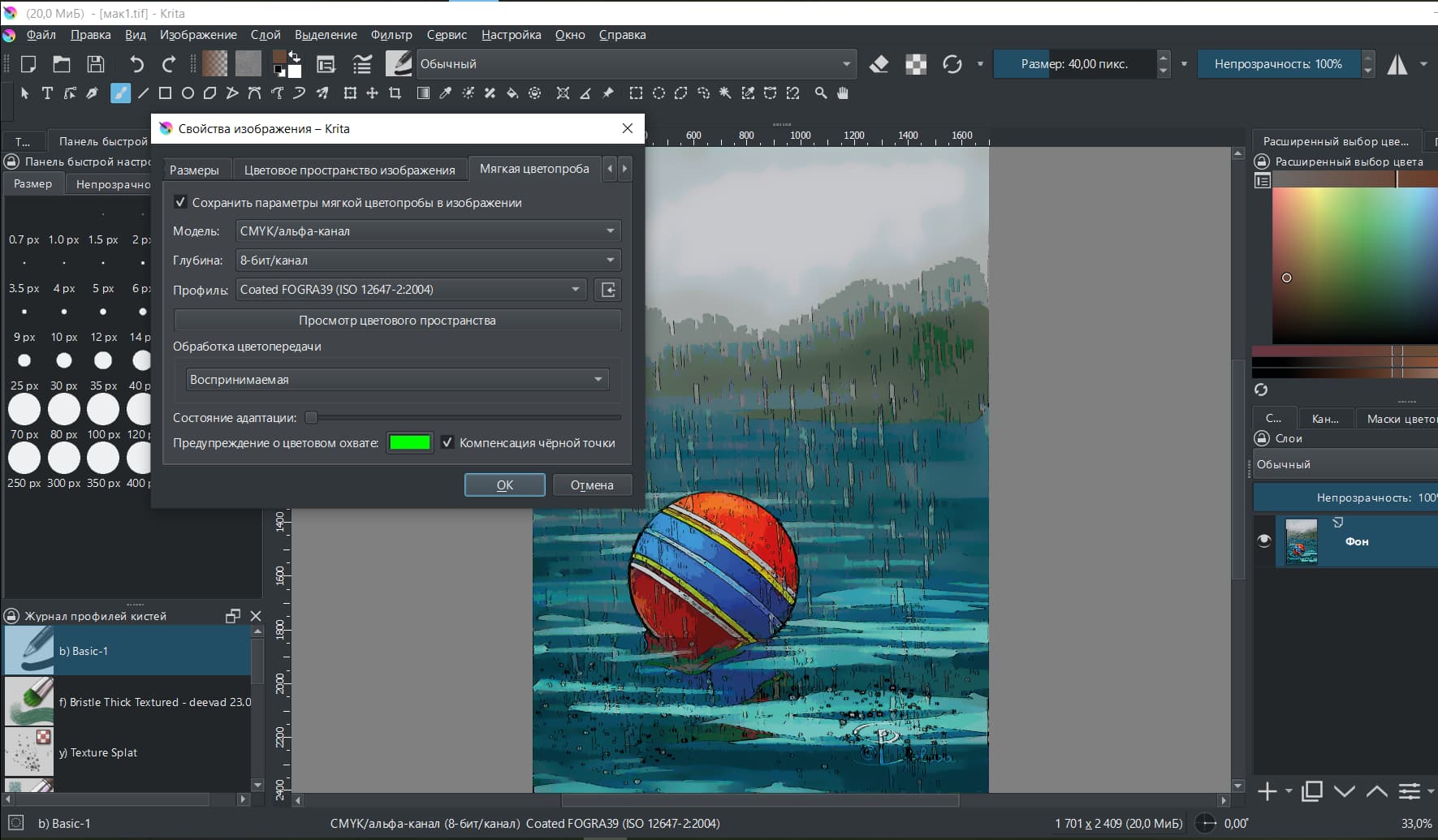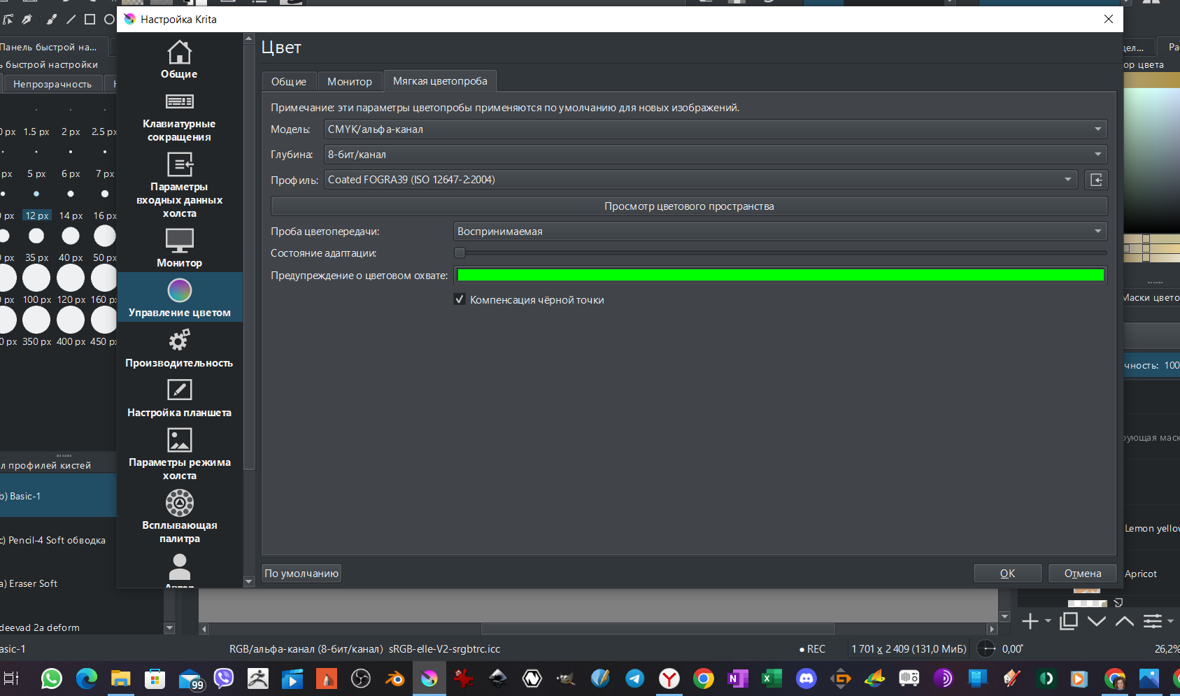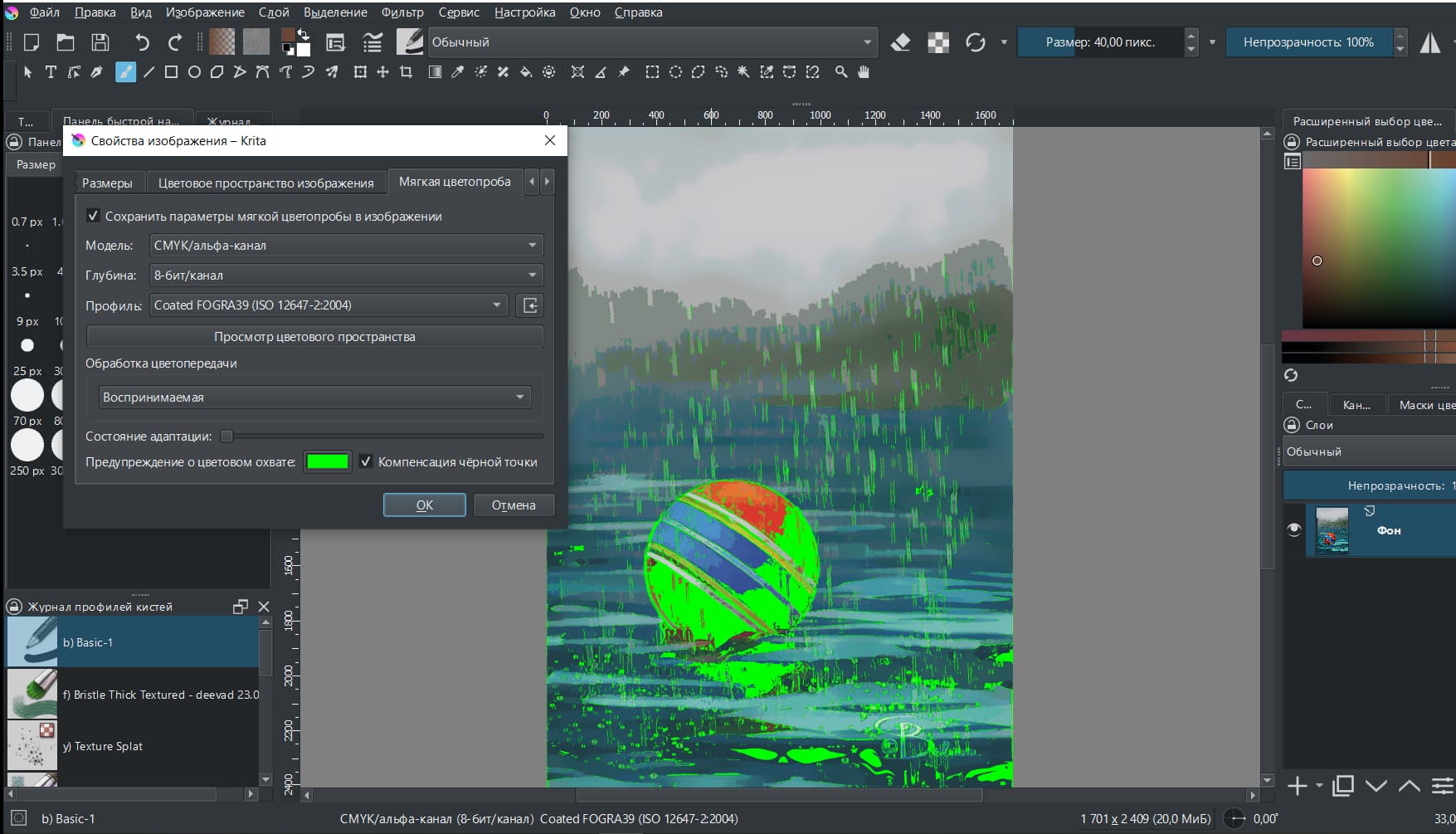 Hello! Help me to understand. I convert the image to CMYK and convert it to a specific color profile. It is also set as a proofing profile in Krita settings. I use black point compensation. Why, when I have already recalculated this image in the CMYK and view the color proof profile in the soft proof mode, do I get colors outside the color gamut? After all, the system had to recalculate the colors in accordance with the specified profile? What am I doing wrong?