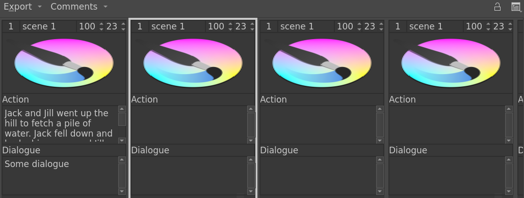 In my limited experience the āSceneā number can apply to multiple Story Items; a scene in a movie is comprised of multiple shots for example. Perhaps multiple Story Items can be categorised per Scene; i.e. have a separate āSceneā entry at the top of the Docker, linking/ tagging the visible Items together. This would help to navigate potentially large Storyboards with multiple Scenes, and Items within them. Upon export, the range of the Storyboard can be measured through Scene numbers, acting like page numbers in PDF export. This allows you to specify which Scenes are exported, and easily create a library/documentation of different elements of your storyboard. Would this require a new file format?