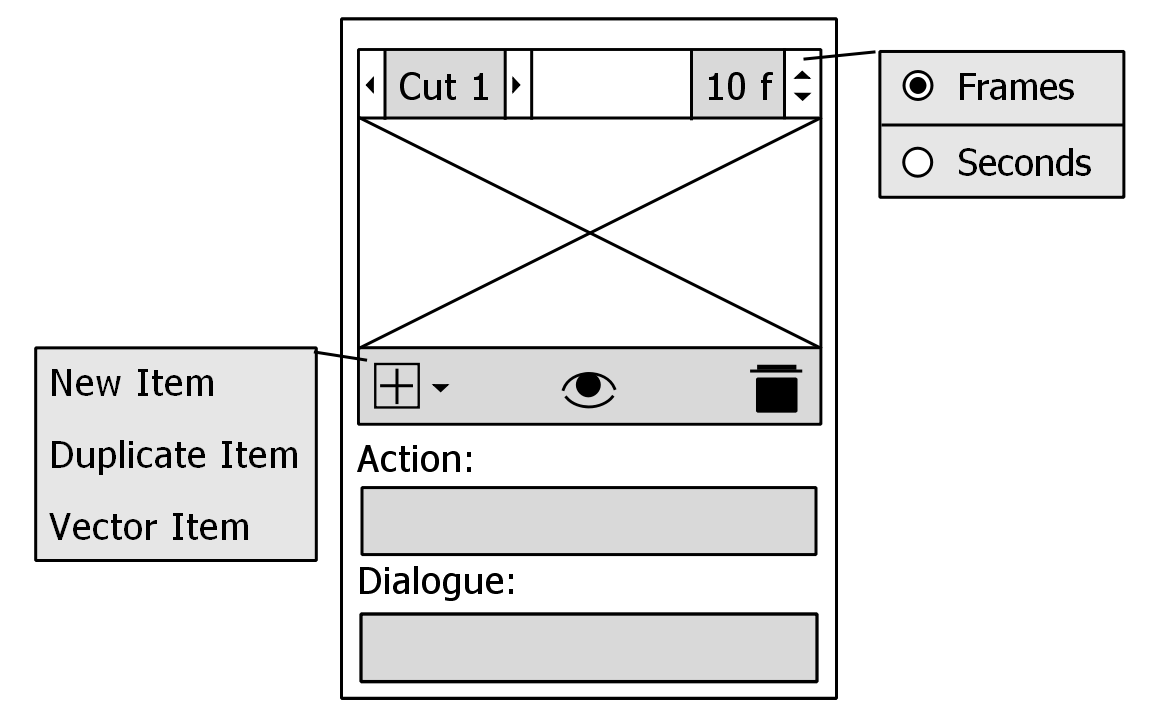 The last addition was a visibility toggle; conceptually it would allow the user to view possible versions of their animatic without specific scenes, allowing them to visualise different story beats in a non-destructive way. Toggling this option would essentially hide the selected Story Item from the Timeline, acting like a āRemove Frame and Pullā function, but allowing reversal of the process at any time thereafter. I hope that wonāt create create too much of a memory issue