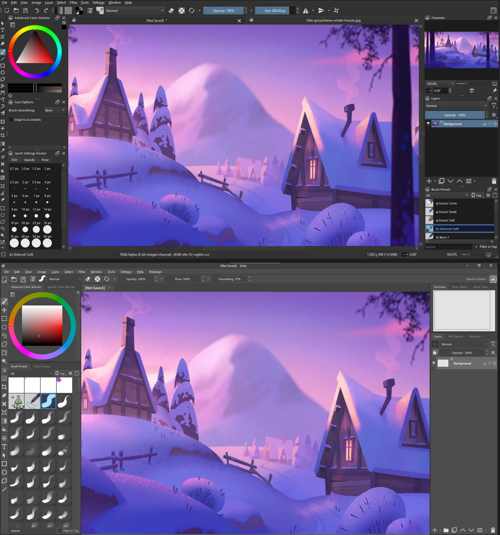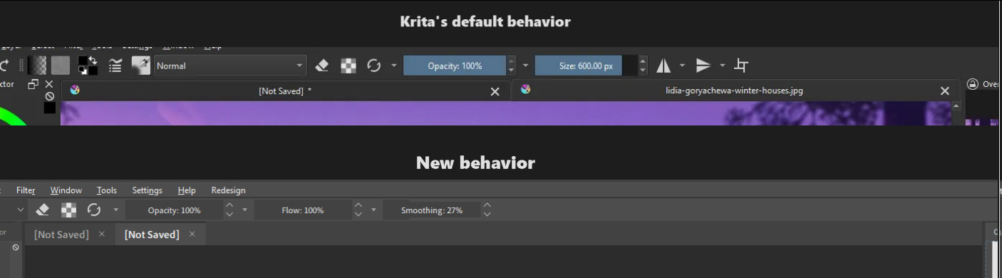 This combined with Krita’s logo appearing on every tab makes the program unnecessarily showy and cramped.