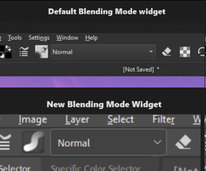 - Blending mode in the toolbar takes more horizontal space than necessary. In most cases artists are using the “Normal” mode with their painting. In edge cases when someone is using “Lambert Lighting (Gamma 2.2)” for their blending mode, perhaps auto expand the blending mode widget or truncate the name instead.