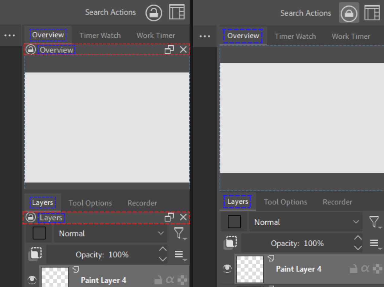 Super Docker Lock is Krita Python Plugin that allows users to lock all of their dockers from being closed or resized while hiding all docker titlebars for a cleaner UI.