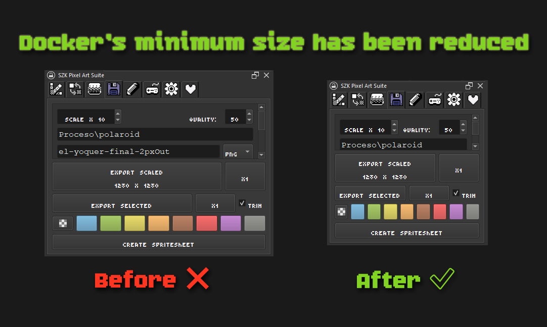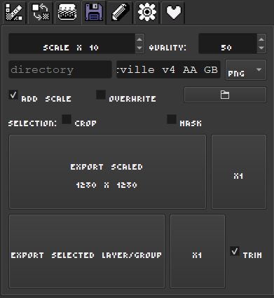 Also, I noticed that I was using a lot the export tab to export the separated pieces of the illustration to my game engine, and I didn’t want them to be scaled. So instead of having to change the scale, I simply added 2 buttons for exporting them at x1 scale.