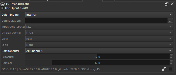 For enabling it: Settings -> Dockers -> LUT Management, and press"Use OpenColorIO"