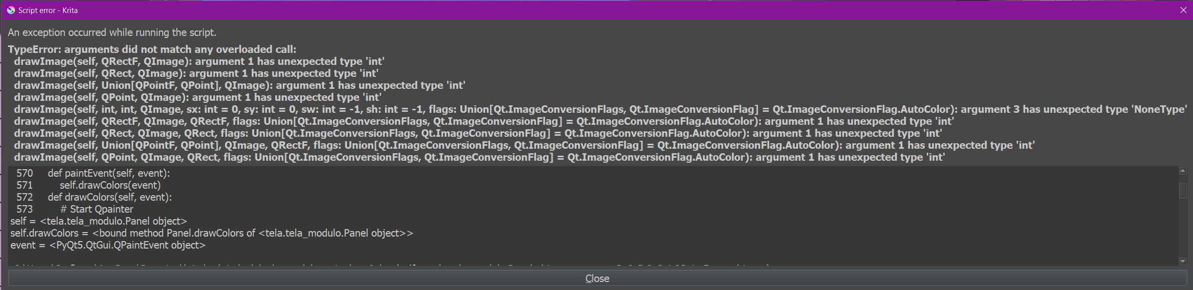 function calls leading up to the error, in the order they occurred.C:\Users\123\AppData\Roaming\krita\pykrita\tela\tela.py in Krita_TIMER(self=<tela.tela.TelaDocker object>)