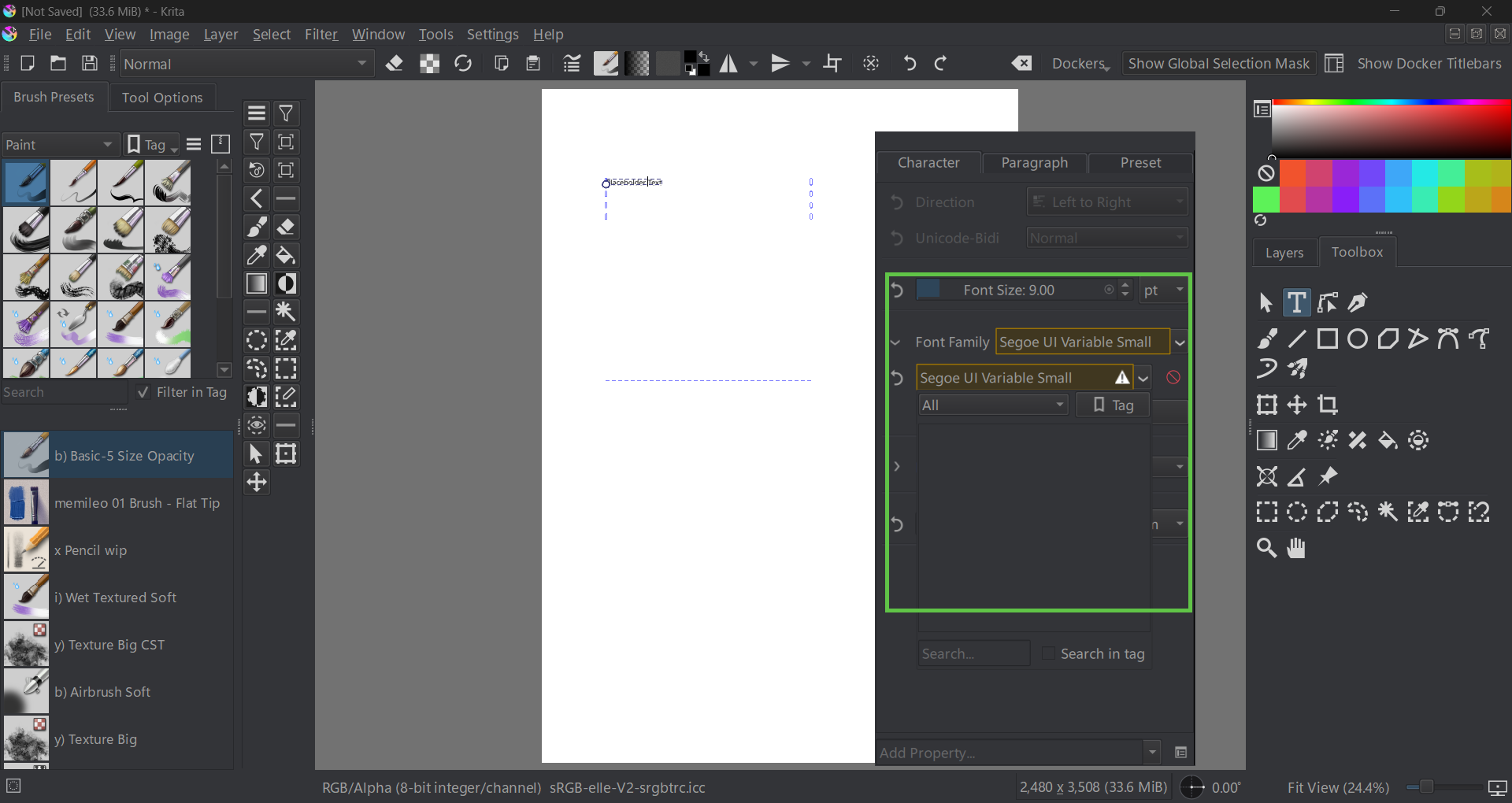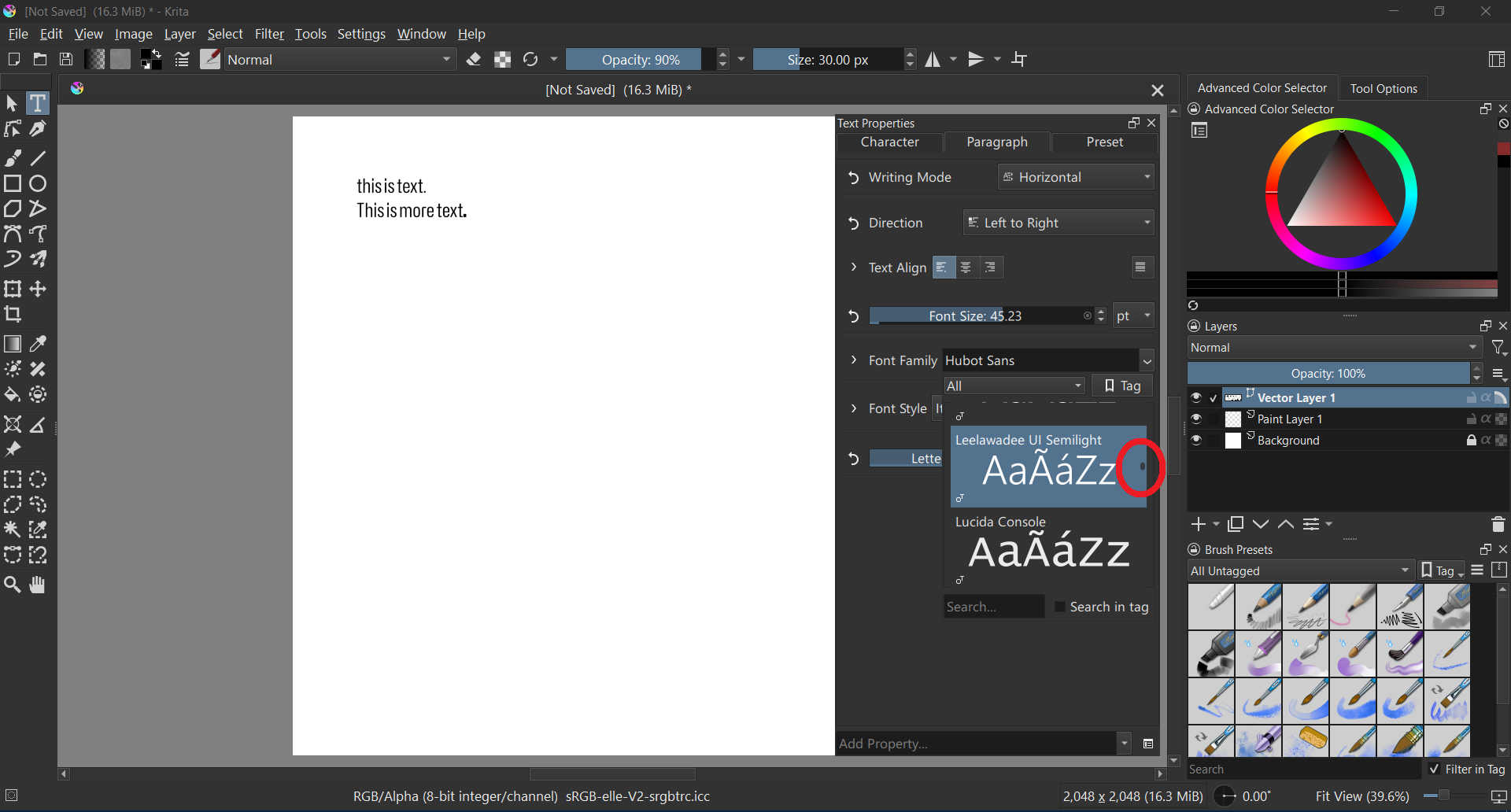 (Similarly, if you have made texts previously with the rich text editor, using Krita 5.2 or older, the editing will not work as expected. There’s an MR with converter functions for these waiting, but it got stuck on UI disagreements)