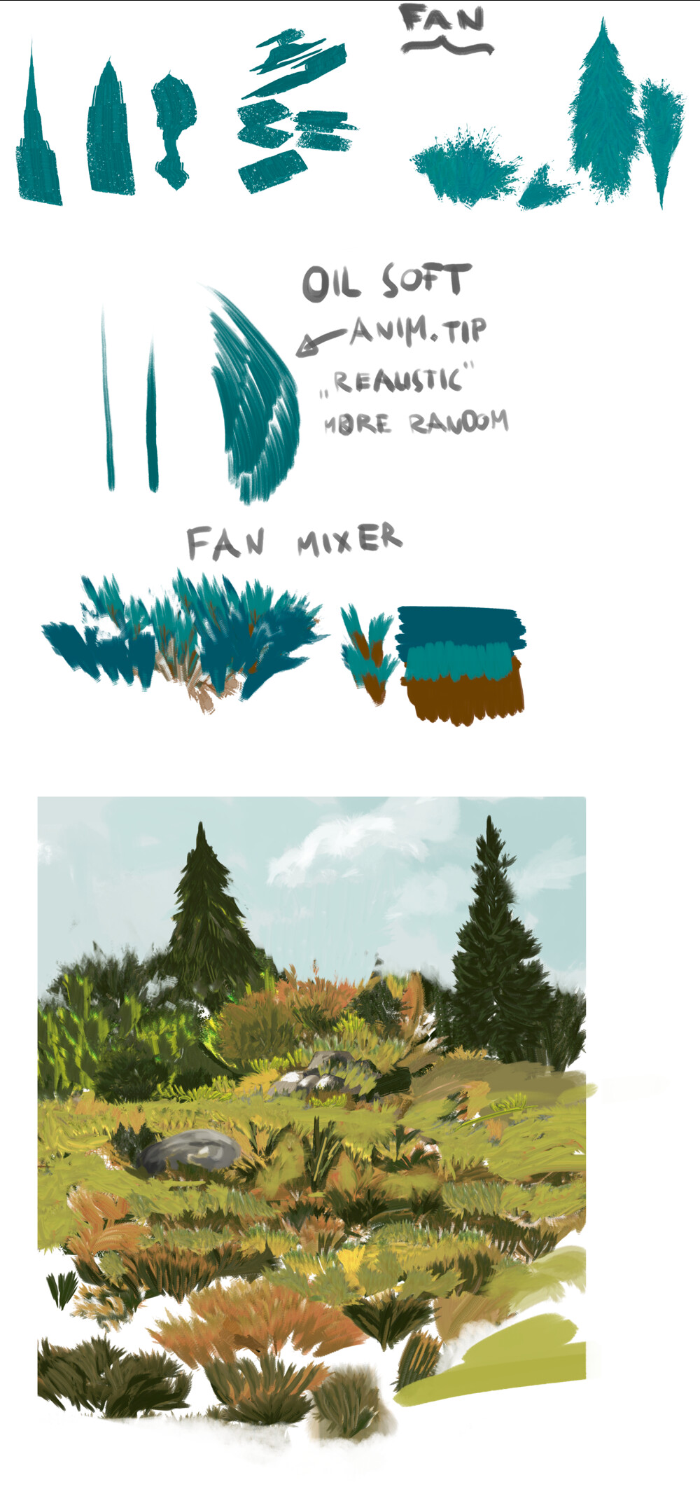 I’m trying to make a “fan brush” work the way I painted with a fan brush in Acrylic and Gouache. So I tried RGBA with Animated brushtips, I need to play around with that more. Also made a new soft Oil Brush (also animated tip), but I don’t like the pressure curve of it yet. I’ll update the pack with them as soon as I feel like they are good. The image is just a test I made with it, didn’t really try to “paint” anything, more just making marks and trying them out.