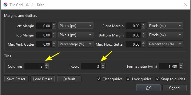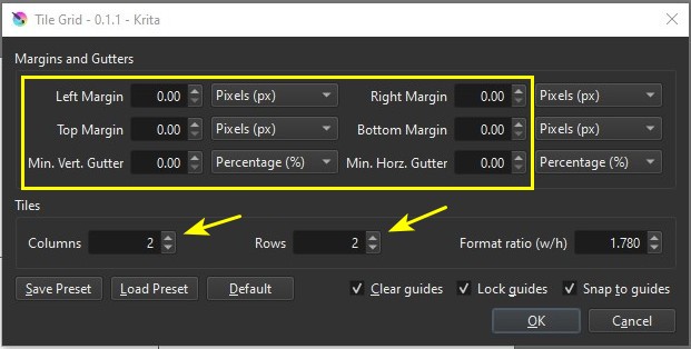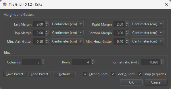 ~/Library/Application Support/krita/pykrita/tile_grid/tile_grid.py in apply_preset(self=<tile_grid.tile_grid.TileGridDialog object>, preset={'clear_guides': True, 'gutter_x': '0,50', 'gutter_x_unit': 'Centimeter (cm)', 'gutter_y': '0,40', 'gutter_y_unit': 'Centimeter (cm)', 'lock_guides': True, 'margin_b': '3,00', 'margin_b_unit': 'Centimeter (cm)', 'margin_l': '2,00', 'margin_l_unit': 'Centimeter (cm)', ...})