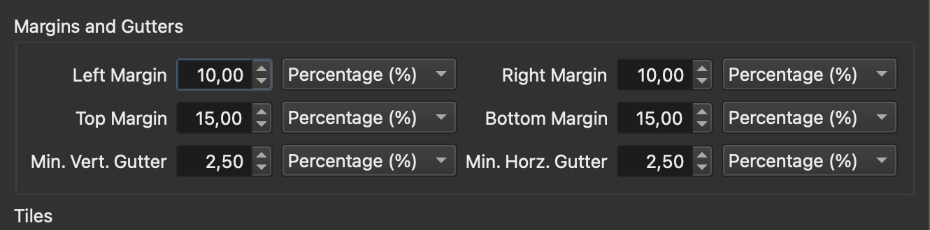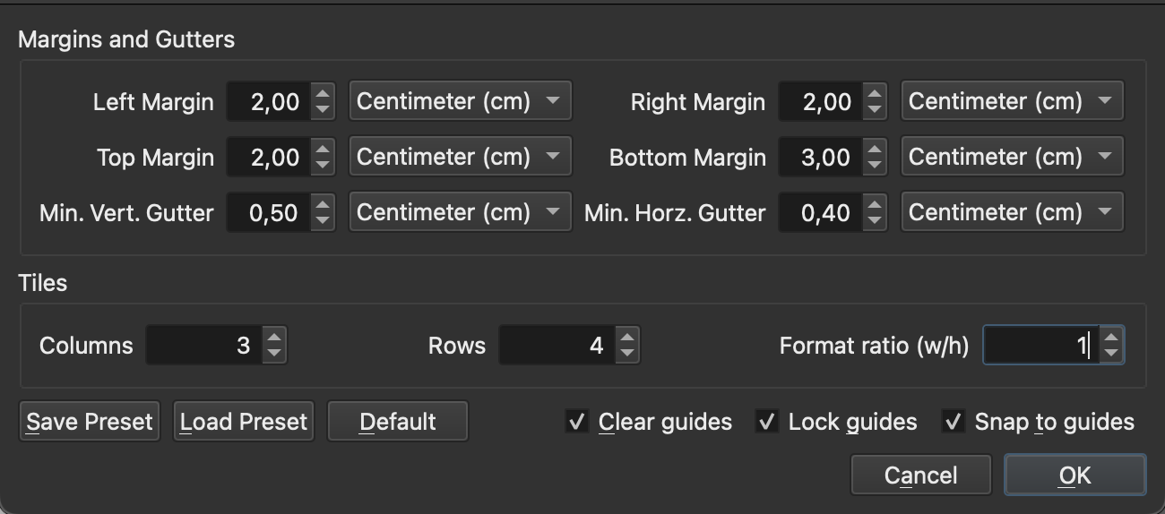 preset = {'clear_guides': True, 'gutter_x': '0,50', 'gutter_x_unit': 'Centimeter (cm)', 'gutter_y': '0,40', 'gutter_y_unit': 'Centimeter (cm)', 'lock_guides': True, 'margin_b': '3,00', 'margin_b_unit': 'Centimeter (cm)', 'margin_l': '2,00', 'margin_l_unit': 'Centimeter (cm)', ...}