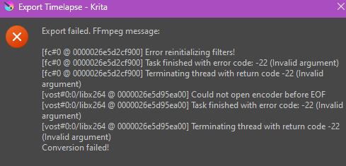 Hey, what operating system are you using? The ffmpeg that comes bundled with Krita is less capable than the one you can install stand alone. Be sure the path to your ffmpeg executable is correct.