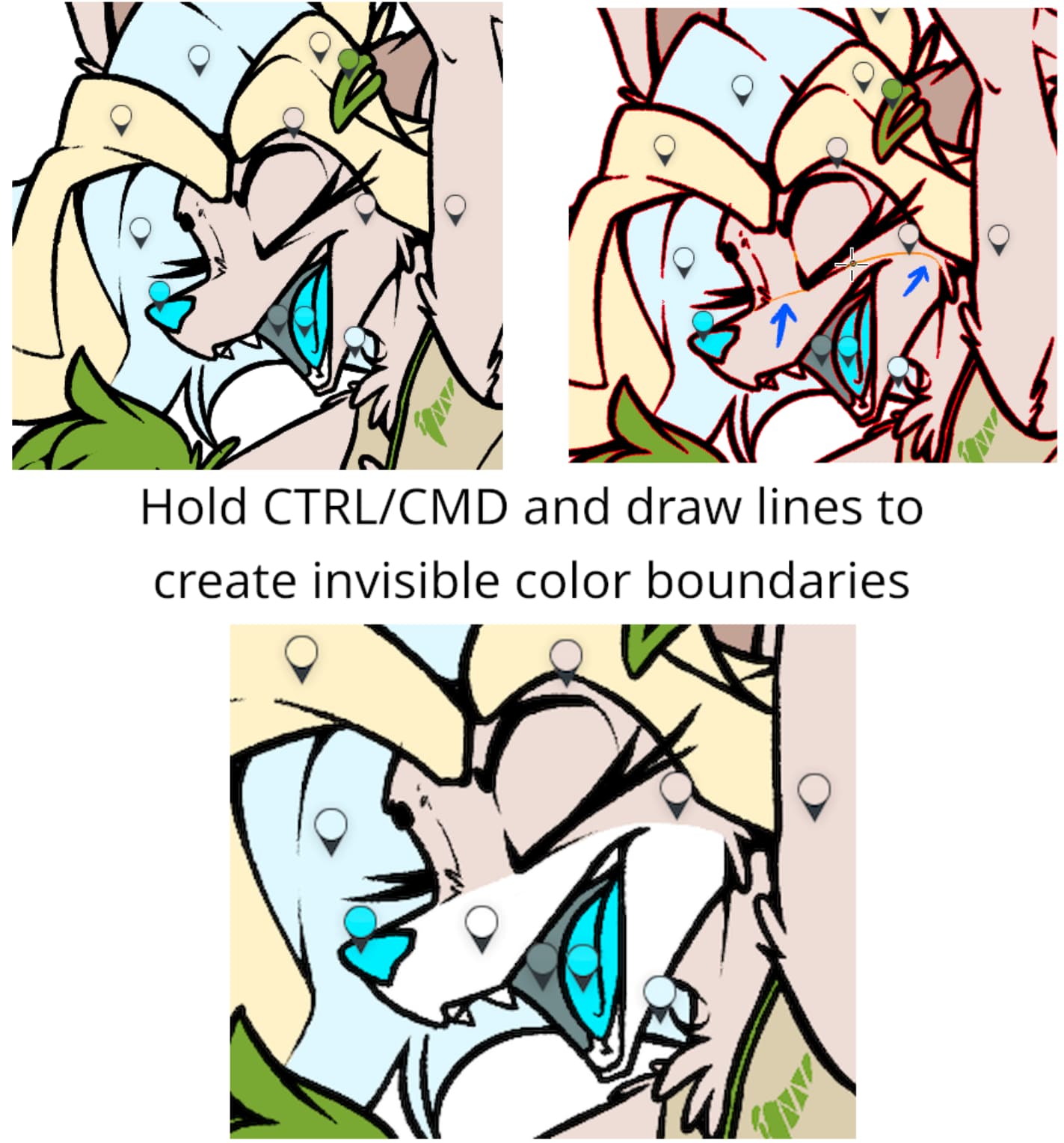 By holding ctrl + dragging with the colorize tool, you can create user-defined custom vector boundaries that divide up the preprocessed areas created by your lineart. This lets you create hard edges to colors without actually making a dividing line on your lineart layer.