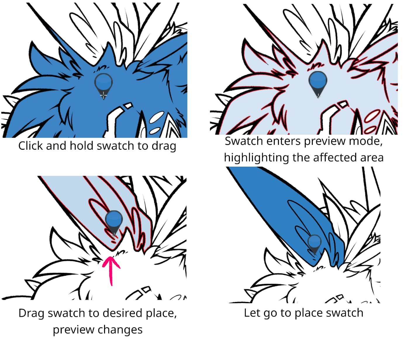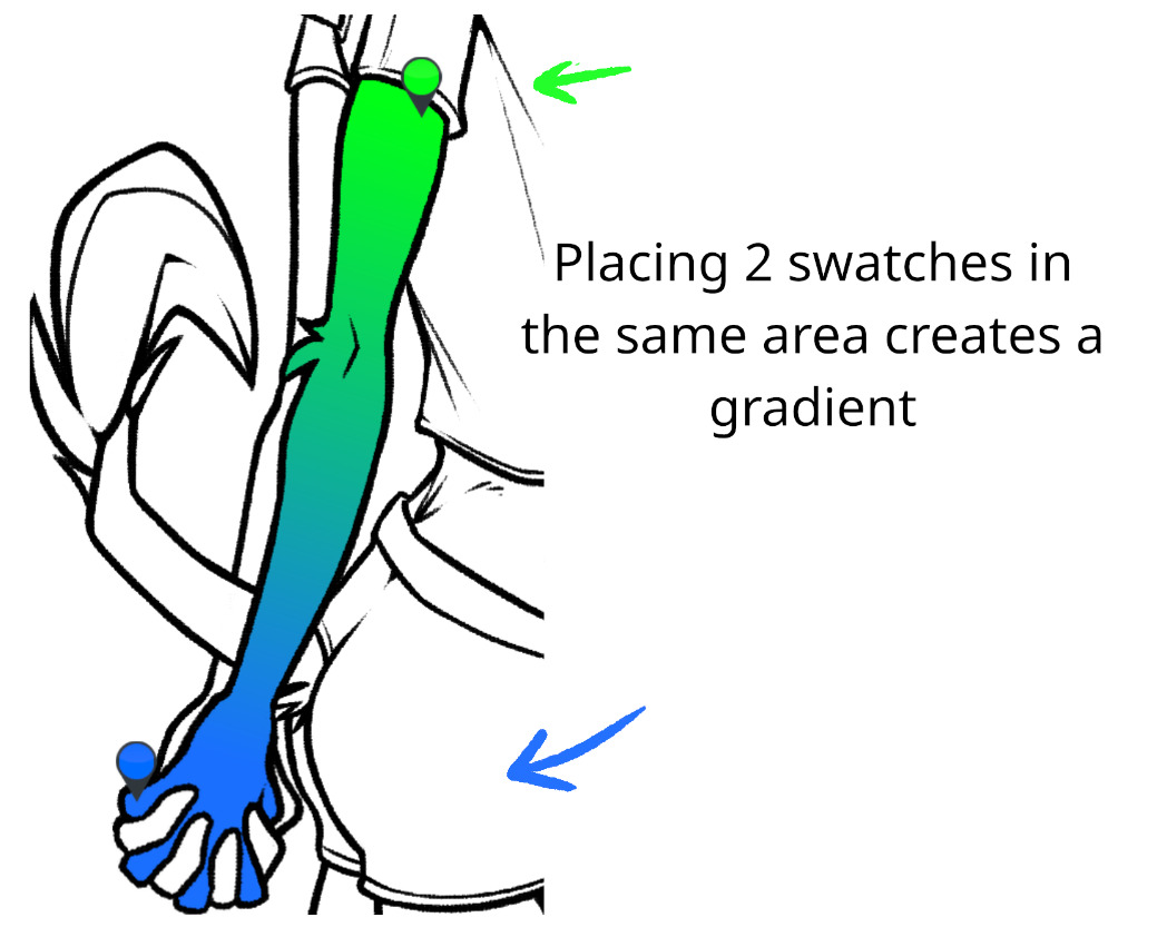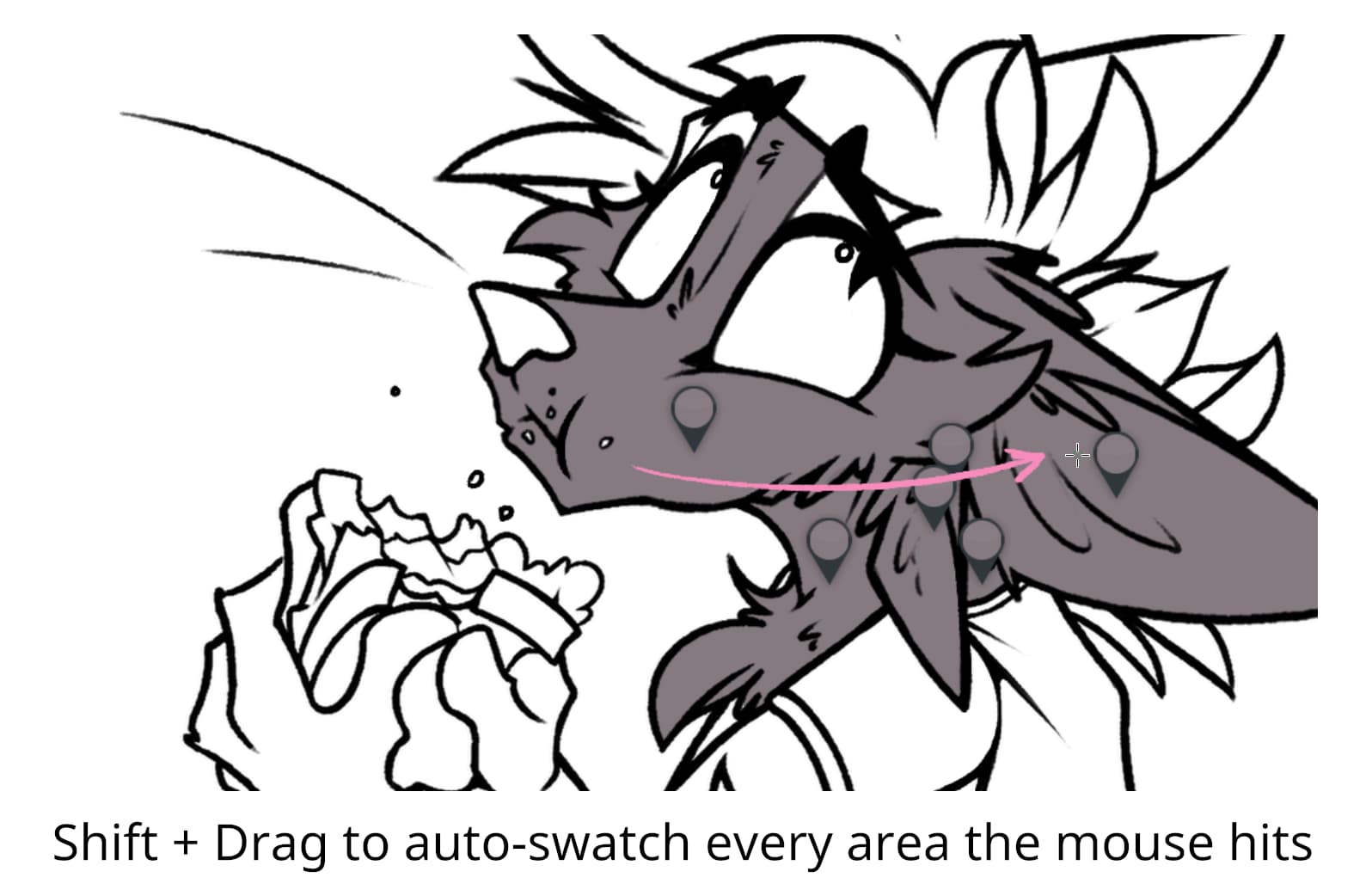 By holding shift and dragging with left click, you automatically place a swatch in every area your mouse hits. Much like the recent 5.1 drag-to-fill-multiple feature, this is the colorize tool implementation of it, and it’s used for quickly filling multiple areas.