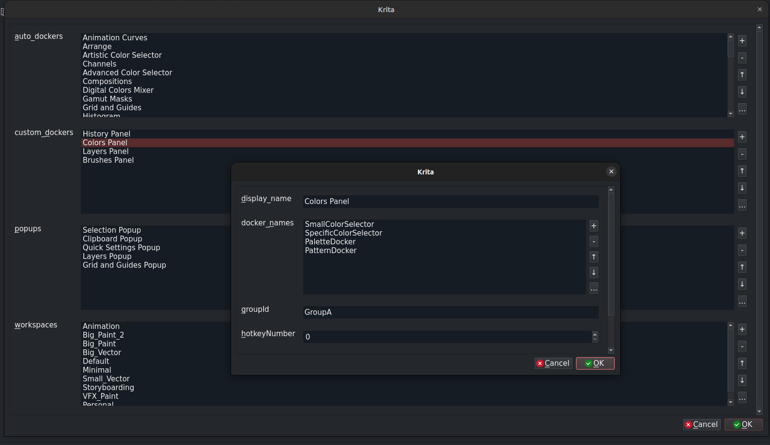 That sounds like an interesting extension possibility. Okay, Docker groups could always be created* via the workspaces and selected and called when needed, that even with different placement of the Dockers, so the “moving” of the Dockers not possible in your plugin, but to call these workspaces via a toolbar button in a toolbar did not work until now.