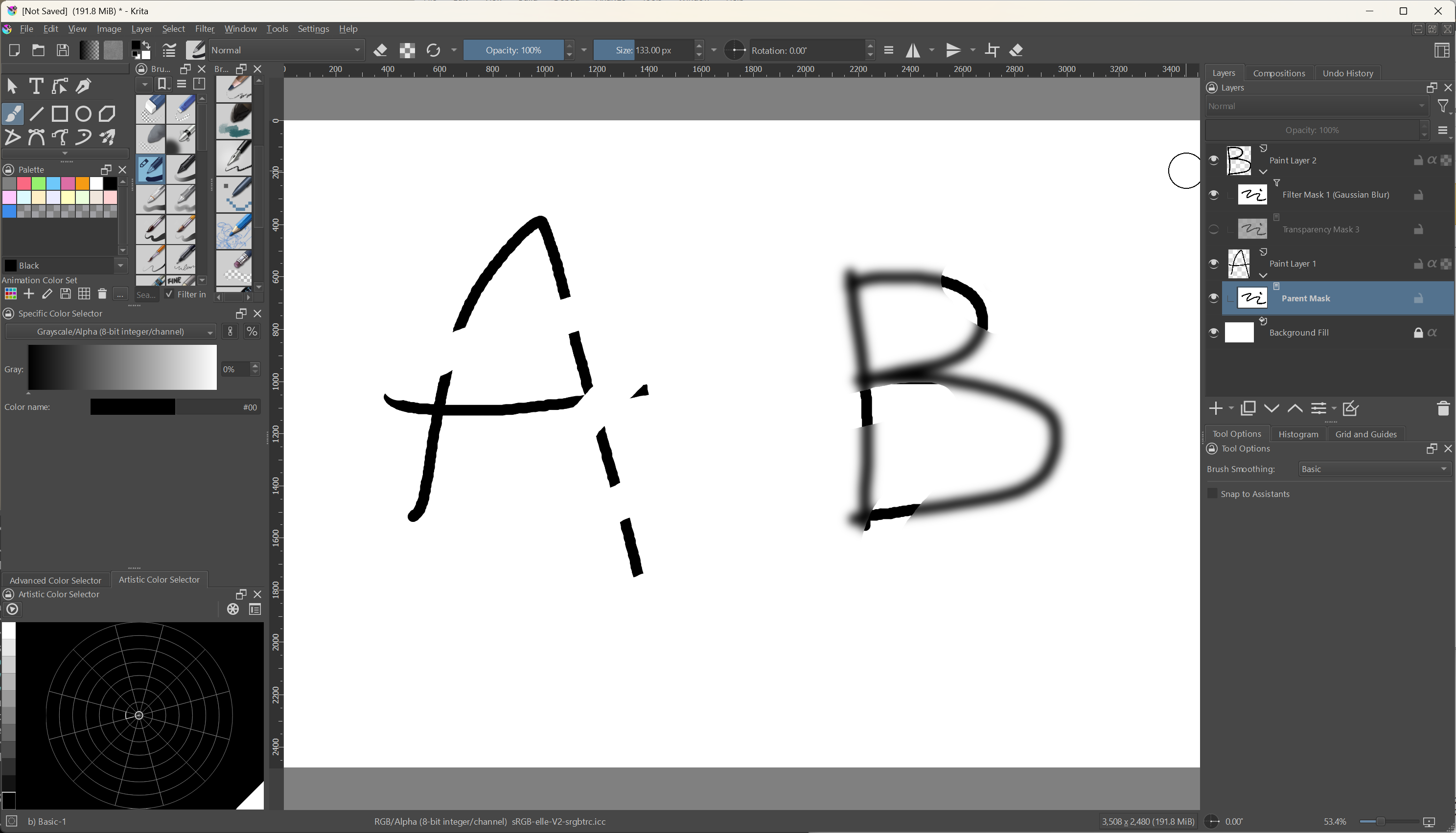 As you can see, the layer “B” doesn’t update on its own because normally masks can only affect their parent. In this case, the bottom mask of layer “A” is the source shared by the other two masks.