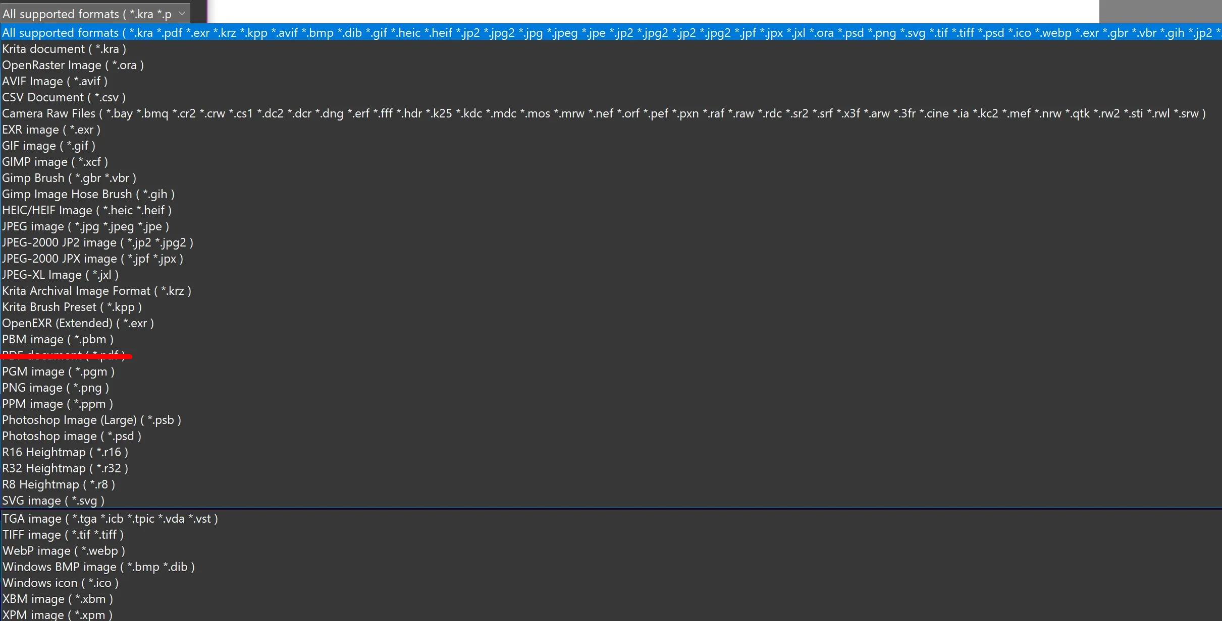 These are the available formats Krita can open (with PDF, I’m not sure, so I “deleted” it, but you should test it via File → Open):