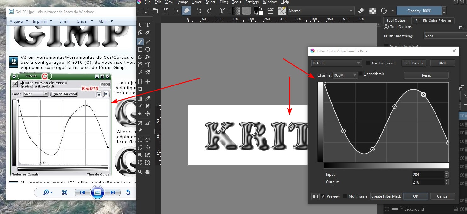 I tried it now, here, with Krita’s Curves. In Gimp it is possible to load curves configurations, there I had this configuration saved with the name of Km010. In Krita I don’t know how to load this, so I set it manually: