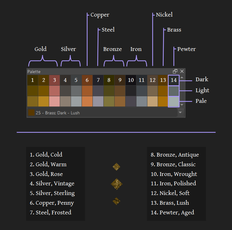 If you just want to get painting, I have a solution! The palette in “Metallics by Draneria”. It’s not perfect but they are convenient and tested, and it’s very fast to use.
