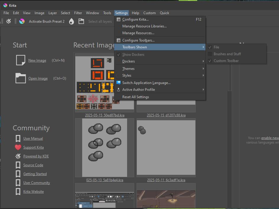 It’s a bit confusing because they seem to show up there when Krita loads, but disappear when a document is loaded When the document is loaded, BrushesAndStuff toolbar appears (and is now ticked) but now the others are hidden… If I tick the others, they still don’t show up. To make them visible it seems adding an action in configure toolbars refreshes them or something. At least I can add some actions to the welcome screen if I wanted:ok_hand: