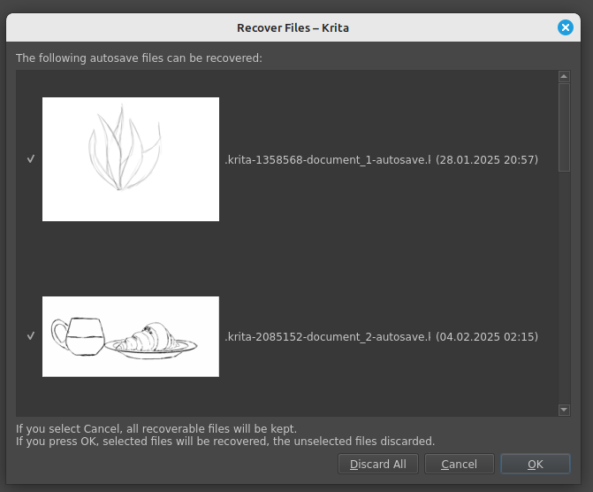 It’s annoying enough on desktop, but it’s way more annoying on Android, when every painting I haven’t saved immediately eventually ends up there, because Android has the tendency to close Krita whenever I open too many other apps. Also on Android all kinds of control is more difficult, so the “Discard All” button is even more dangerous there (and ending up with a thousands of opened recovered files is even more annoying and difficult and tedious to recover from).